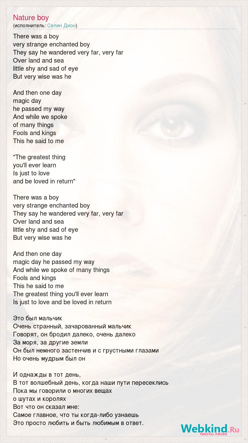There was a boy very strange enchanted boy They say he wandered very far, very far Over land and sea little shy and sad of eye But very wise was he And then one day magic day he passed my way And while we spoke of many things Fools and kings This he said to me "The greatest thing you'll ever learn Is just to love and be loved in return" There was a boy very strange enchanted boy They say he wandered very far, very far Over land and sea little shy and sad of eye But very wise was he And then one day magic day he passed my way And while we spoke of many things Fools and kings This he said to me The greatest thing you'll ever learn Is just to love and be loved in return Это был мальчик Очень странный, зачарованный мальчик Говорят, он бродил далеко, очень далеко За моря, за другие земли Он был немного застенчив и с грустными глазами Но очень мудрым был он И однажды в тот день, В тот волшебный день, когда наши пути пересеклись Пока мы говорили о многих вещах о шутах и королях Вот что он сказал мне: Самое главное, что ты когда-либо узнаешь Это просто любить и быть любимым в ответ.