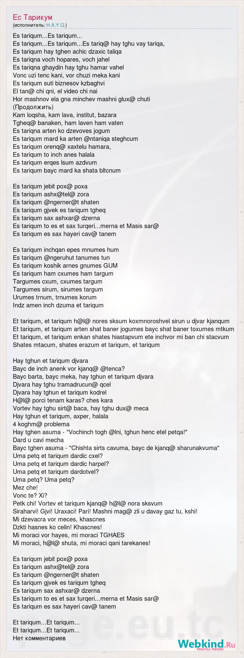 Es tariqum...Es tariqum... Es tariqum...Es tariqum...Es tariq@ hay tghu vay tariqa, Es tariqum hay tghen achic dzaxic taliqa Es tariqna voch hopares, voch jahel Es tariqna ghaydin hay tghu hamar vahel Vonc uzi tenc kani, vor chuzi meka kani Es tariqum suti biznesov kzbaghvi El tan@ chi qni, el video chi nai Hor mashnov ela gna minchev mashni glux@ chuti (Продолжить) Kam loqsha, kam lava, institut, bazara Tgheq@ banaken, ham laven ham vaten Es tariqna arten ko dzevoves jogum Es tariqum mard ka arten @ntaniqa steghcum Es tariqum orenq@ xaxtelu hamara, Es tariqum to inch anes halala Es tariqum erqes lsum azdvum Es tariqum bayc mard ka shata bltcnum Es tariqum jebit pox@ poxa Es tariqum ashx@tel@ zora Es tariqum @ngerner@t shaten Es tariqum gjvek es tariqum tgheq Es tariqum sax ashxar@ dzerna Es tariqum to es et sax turqeri...merna et Masis sar@ Es tariqum es sax hayeri cav@ tanem Es tariqum inchqan epes mnumes hum Es tariqum @ngeruhut tanumes tun Es tariqum koshik arnes gnumes GUM Es tariqum ham cxumes ham targum Targumes cxum, cxumes targum Targumes sirum, sirumes targum Urumes trnum, trnumes korum Indz amen inch dzuma et tariqum Et tariqum, et tariqum h@l@ nores sksum koxmnoroshvel sirun u djvar kjanqum Et tariqum, et tariqum arten shat baner jogumes bayc shat baner toxumes mtkum Et tariqum, et tariqum enkan shates hiastapvum ete inchvor mi ban chi stacvum Shates mtacum, shates erazum et tariqum, et tariqum Hay tghun et tariqum djvara Bayc de inch anenk vor kjanq@ @tenca? Bayc barta, bayc meka, hay tghun et tariqum djvara Djvara hay tghu tramadrucun@ qcel Djvara hay tghun et tariqum kodrel H@l@ porci tenam karas? ches kara Vortev hay tghu sirt@ baca, hay tghu dux@ meca Hay tghun et tariqum, axper, halala 4 koghm@ problema Hay tghen asuma - "Vochinch togh @lni, tghun henc etel petqa!" Dard u cavi mecha Bayc tghen asuma - "Chishta sirts cavuma, bayc de kjanq@ sharunakvuma" Uma petq et tariqum dardic cxel? Uma petq et tariqum dardic harpel? Uma petq et tariqum dardotvel? Uma petq? Uma petq? Mez che! Vonc te? Xi? Petk chi! Vortev et tariqum kjanq@ h@l@ nora sksvum Siraharvi! Gjvi! Uraxaci! Pari! Mashni mag@ zli u davay gaz tu, kshi! Mi dzevacra vor meces, khascnes Dzkti hasnes ko celin! Khascnes! Mi moraci vor hayes, mi moraci TGHAES Mi moraci, h@l@ shuta, mi moraci qani tarekanes! Es tariqum jebit pox@ poxa Es tariqum ashx@tel@ zora Es tariqum @ngerner@t shaten Es tariqum gjvek es tariqum tgheq Es tariqum sax ashxar@ dzerna Es tariqum to es et sax turqeri...merna et Masis sar@ Es tariqum es sax hayeri cav@ tanem Et tariqum...Et tariqum... Et tariqum...Et tariqum... Нет комментариев