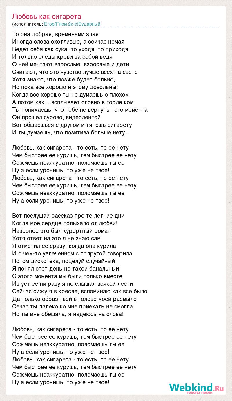 То она добрая, временами злая Иногда слова охотливые, а сейчас немая Ведет себя как сука, то уходя, то приходя И только следы крови за собой ведя О ней мечтают взрослые, взрослые и дети Считают, что это чувство лучше всех на свете Хотя знают, что позже будет больно, Но пока все хорошо и этому довольны! Когда все хорошо ты не думаешь о плохом А потом как ...всплывает словно в горле ком Ты понимаешь, что тебе не вернуть того момента Он прошел сурово, видеолентой Вот общаешься с другом и тянешь сигарету И ты думаешь, что позитива больше нету... Любовь, как сигарета - то есть, то ее нету Чем быстрее ее куришь, тем быстрее ее нету Сожмешь неаккуратно, поломаешь ты ее Ну а если уронишь, то уже не твое! Любовь, как сигарета - то есть, то ее нету Чем быстрее ее куришь, тем быстрее ее нету Сожмешь неаккуратно, поломаешь ты ее Ну а если уронишь, то уже не твое! Вот послушай рассказ про те летние дни Когда мое сердце полыхало от любви! Наверное это был курортный роман Хотя ответ на это я не знаю сам Я отметил ее сразу, когда она курила И о чем-то увлеченном с подругой говорила Потом дискотека, поцелуй случайный Я понял этот день не такой банальный С этого момента мы были только вместе Из уст ее ни разу я не слышал всякой лести Сейчас сижу я в кресле, вспоминаю как все было Да только образ твой в голове моей размыло Сечас ты далеко ко мне приехать не смогла Но ты мне обещала, я надеюсь на слова! Любовь, как сигарета - то есть, то ее нету Чем быстрее ее куришь, тем быстрее ее нету Сожмешь неаккуратно, поломаешь ты ее Ну а если уронишь, то уже не твое! Любовь, как сигарета - то есть, то ее нету Чем быстрее ее куришь, тем быстрее ее нету Сожмешь неаккуратно, поломаешь ты ее Ну а если уронишь, то уже не твое!