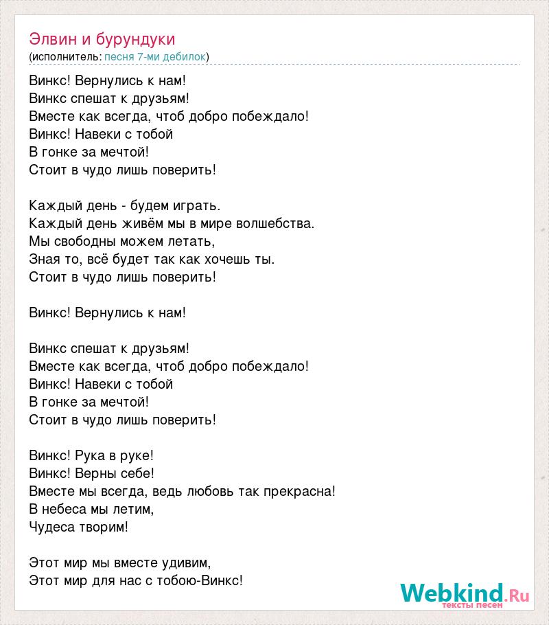 Винкс! Вернулись к нам! Винкс спешат к друзьям! Вместе как всегда, чтоб добро побеждало! Винкс! Навеки с тобой В гонке за мечтой! Стоит в чудо лишь поверить! Каждый день - будем играть. Каждый день живём мы в мире волшебства. Мы свободны можем летать, Зная то, всё будет так как хочешь ты. Стоит в чудо лишь поверить! Винкс! Вернулись к нам! Винкс спешат к друзьям! Вместе как всегда, чтоб добро побеждало! Винкс! Навеки с тобой В гонке за мечтой! Стоит в чудо лишь поверить! Винкс! Рука в руке! Винкс! Верны себе! Вместе мы всегда, ведь любовь так прекрасна! В небеса мы летим, Чудеса творим! Этот мир мы вместе удивим, Этот мир для нас с тобою-Винкс!