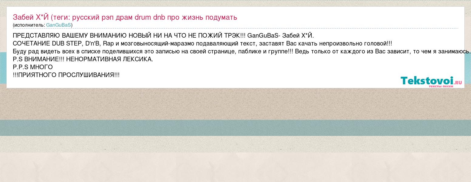 Главная→Исполнители→GanGuBaS→Забей Х*Й (теги: русский рэп драм drum dnb про жизнь подумать парит крутой