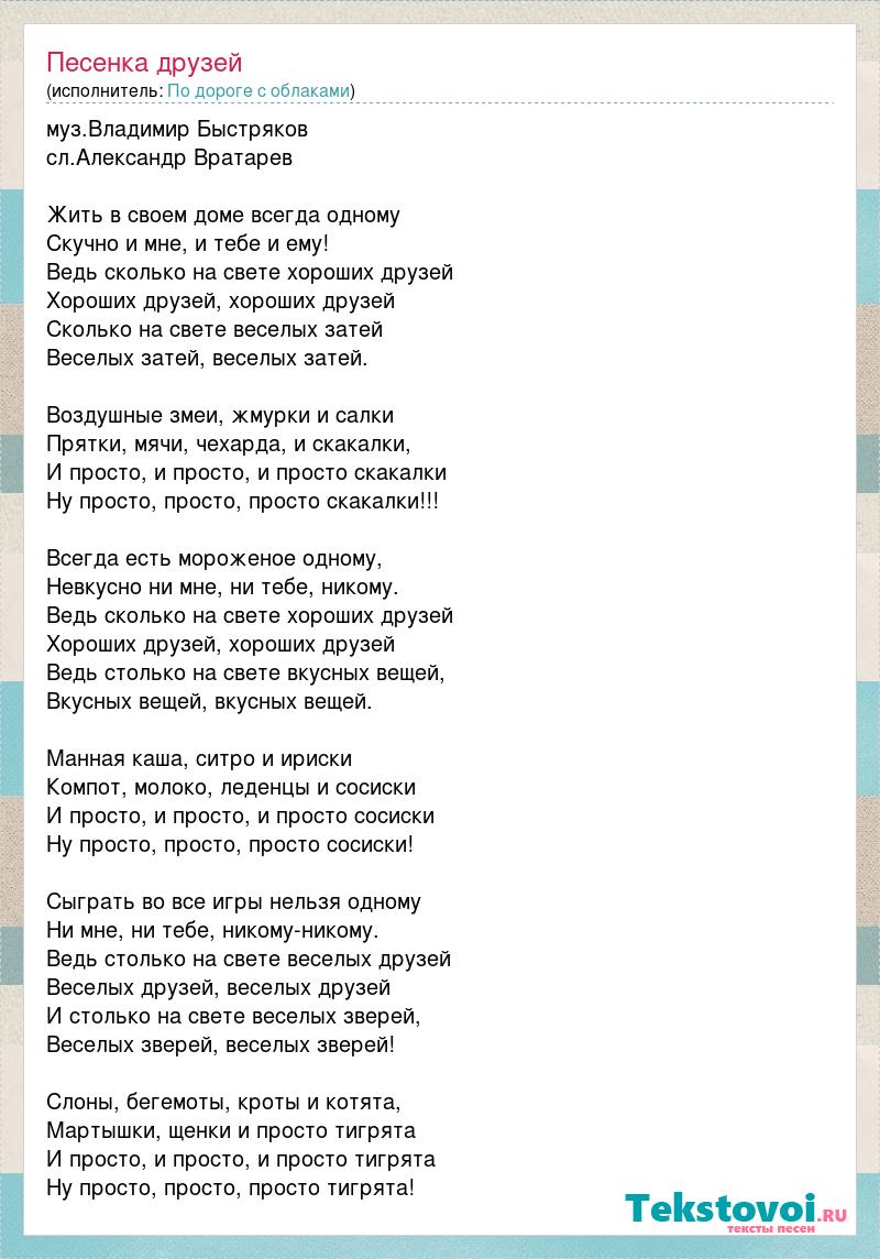 муз.Владимир Быстряков сл.Александр Вратарев Жить в своем доме всегда одному Скучно и мне, и тебе и ему! Ведь сколько на свете хороших друзей Хороших друзей, хороших друзей Сколько на свете веселых затей Веселых затей, веселых затей. Воздушные змеи, жмурки и салки Прятки, мячи, чехарда, и скакалки, И просто, и просто, и просто скакалки Ну просто, просто, просто скакалки!!! Всегда есть мороженое одному, Невкусно ни мне, ни тебе, никому. Ведь сколько на свете хороших друзей Хороших друзей, хороших друзей Ведь столько на свете вкусных вещей, Вкусных вещей, вкусных вещей. Манная каша, ситро и ириски Компот, молоко, леденцы и сосиски И просто, и просто, и просто сосиски Ну просто, просто, просто сосиски! Сыграть во все игры нельзя одному Ни мне, ни тебе, никому-никому. Ведь столько на свете веселых друзей Веселых друзей, веселых друзей И столько на свете веселых зверей, Веселых зверей, веселых зверей! Слоны, бегемоты, кроты и котята, Мартышки, щенки и просто тигрята И просто, и просто, и просто тигрята Ну просто, просто, просто тигрята!