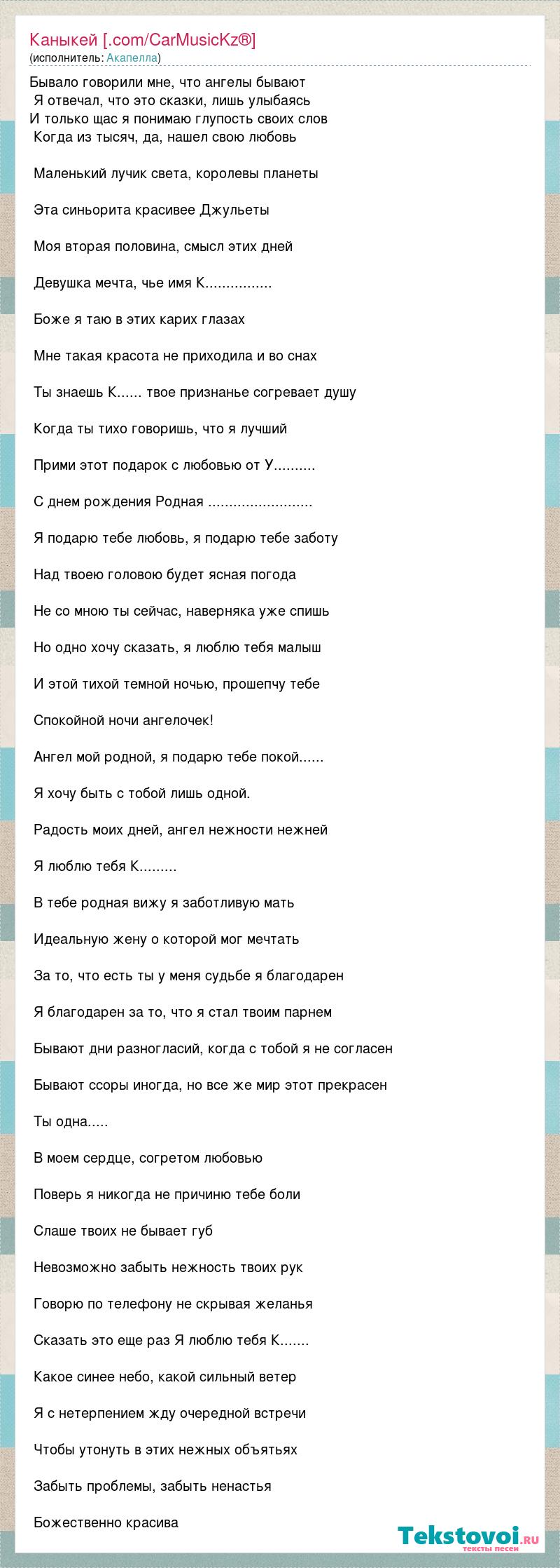 Бывало говорили мне, что ангелы бывают Я отвечал, что это сказки, лишь улыбаясь И только щас я понимаю глупость своих слов Когда из тысяч, да, нашел свою любовь Маленький лучик света, королевы планеты Эта синьорита красивее Джульеты Моя вторая половина, смысл этих дней Девушка мечта, чье имя К................ Боже я таю в этих карих глазах Мне такая красота не приходила и во снах Ты знаешь К...... твое признанье согревает душу Когда ты тихо говоришь, что я лучший Прими этот подарок с любовью от У.......... С днем рождения Родная ......................... Я подарю тебе любовь, я подарю тебе заботу Над твоею головою будет ясная погода Не со мною ты сейчас, наверняка уже спишь Но одно хочу сказать, я люблю тебя малыш И этой тихой темной ночью, прошепчу тебе Спокойной ночи ангелочек! Ангел мой родной, я подарю тебе покой...... Я хочу быть с тобой лишь одной. Радость моих дней, ангел нежности нежней Я люблю тебя К......... В тебе родная вижу я заботливую мать Идеальную жену о которой мог мечтать За то, что есть ты у меня судьбе я благодарен Я благодарен за то, что я стал твоим парнем Бывают дни разногласий, когда с тобой я не согласен Бывают ссоры иногда, но все же мир этот прекрасен Ты одна..... В моем сердце, согретом любовью Поверь я никогда не причиню тебе боли Слаше твоих не бывает губ Невозможно забыть нежность твоих рук Говорю по телефону не скрывая желанья Сказать это еще раз Я люблю тебя К....... Какое синее небо, какой сильный ветер Я с нетерпением жду очередной встречи Чтобы утонуть в этих нежных объятьях Забыть проблемы, забыть ненастья Божественно красива