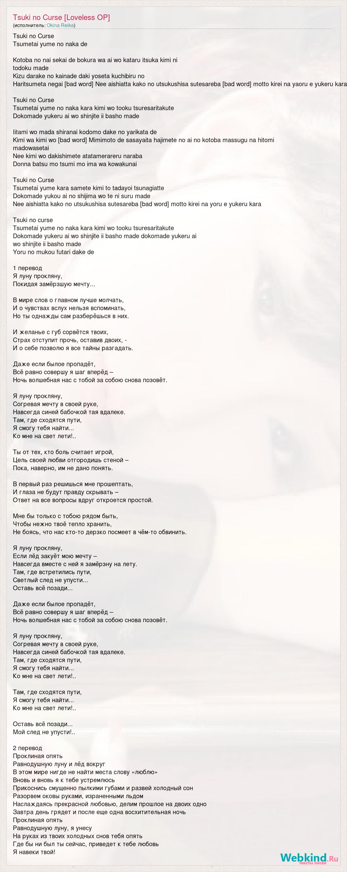 Tsuki no Curse Tsumetai yume no naka de Kotoba no nai sekai de bokura wa ai wo kataru itsuka kimi ni todoku made Kizu darake no kainade daki yoseta kuchibiru no Haritsumeta negai [bad word] Nee aishiatta kako no utsukushisa sutesareba [bad word] motto kirei na yaoru e yukeru kara Tsuki no Curse Tsumetai yume no naka kara kimi wo tooku tsuresaritakute Dokomade yukeru ai wo shinjite ii basho made Iitami wo mada shiranai kodomo dake no yarikata de Kimi wa kimi wo [bad word] Mimimoto de sasayaita hajimete no ai no kotoba massugu na hitomi madowasetai Nee kimi wo dakishimete atatamerareru naraba Donna batsu mo tsumi mo ima wa kowakunai Tsuki no Curse Tsumetai yume kara samete kimi to tadayoi tsunagiatte Dokomade yukou ai no shijima wo te ni suru made Nee aishiatta kako no utsukushisa sutesareba [bad word] motto kirei na yoru e yukeru kara Tsuki no curse Tsumetai yume no naka kara kimi wo tooku tsuresaritakute Dokomade yukeru ai wo shinjite ii basho made dokomade yukeru ai wo shinjite ii basho made Yoru no mukou futari dake de 1 перевод Я луну прокляну, Покидая замёрзшую мечту... В мире слов о главном лучше молчать, И о чувствах вслух нельзя вспоминать, Но ты однажды сам разберёшься в них. И желанье с губ сорвётся твоих, Страх отступит прочь, оставив двоих, - И о себе позволю я все тайны разгадать. Даже если былое пропадёт, Всё равно совершу я шаг вперёд – Ночь волшебная нас с тобой за собою снова позовёт. Я луну прокляну, Согревая мечту в своей руке, Навсегда синей бабочкой тая вдалеке. Там, где сходятся пути, Я смогу тебя найти... Ко мне на свет лети!.. Ты от тех, кто боль считает игрой, Цель своей любви отгородишь стеной – Пока, наверно, им не дано понять. В первый раз решишься мне прошептать, И глаза не будут правду скрывать – Ответ на все вопросы вдруг откроется простой. Мне бы только с тобою рядом быть, Чтобы нежно твоё тепло хранить, Не боясь, что нас кто-то дерзко посмеет в чём-то обвинить. Я луну прокляну, Если лёд закуёт мою мечту – Навсегда вместе с ней я замёрзну на лету. Там, где встретились пути, Светлый след не упусти... Оставь всё позади... Даже если былое пропадёт, Всё равно совершу я шаг вперёд – Ночь волшебная нас с тобой за собою снова позовёт. Я луну прокляну, Согревая мечту в своей руке, Навсегда синей бабочкой тая вдалеке. Там, где сходятся пути, Я смогу тебя найти... Ко мне на свет лети!.. Там, где сходятся пути, Я смогу тебя найти... Ко мне на свет лети!.. Оставь всё позади... Мой след не упусти!.. 2 перевод Проклиная опять Равнодушную луну и лёд вокруг В этом мире нигде не найти места слову «люблю» Вновь и вновь я к тебе устремлюсь Прикоснись смущенно пылкими губами и развей холодный сон Разорвем оковы руками, израненными льдом Наслаждаясь прекрасной любовью, делим прошлое на двоих одно Завтра день грядет и после еще одна восхитительная ночь Проклиная опять Равнодушную луну, я унесу На руках из твоих холодных снов тебя опять Где бы ни был ты сейчас, приведет к тебе любовь Я навеки твой!