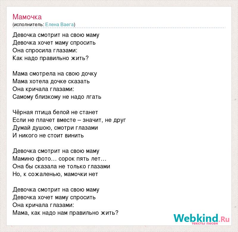 Девочка смотрит на свою маму Девочка хочет маму спросить Она спросила глазами: Как надо правильно жить? Мама смотрела на свою дочку Мама хотела дочке сказать Она кричала глазами: Самому близкому не надо лгать Чёрная птица белой не станет Если не плачет вместе – значит, не друг Думай душою, смотри глазами И никого не стоит винить Девочка смотрит на свою маму Мамино фото… сорок пять лет… Она бы сказала не только глазами Но, к сожаленью, мамочки нет Девочка смотрит на свою маму Девочка хочет маму спросить Она кричала глазами: Мама, как надо нам правильно жить?