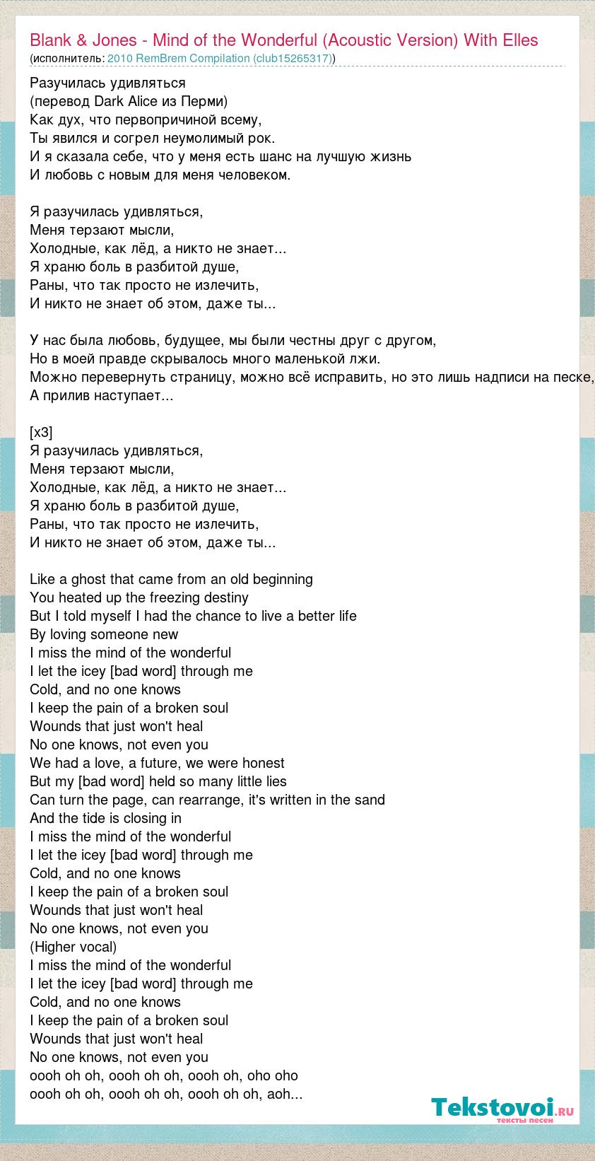 Разучилась удивляться (перевод Dark Alice из Перми) Как дух, что первопричиной всему, Ты явился и согрел неумолимый рок. И я сказала себе, что у меня есть шанс на лучшую жизнь И любовь с новым для меня человеком. Я разучилась удивляться, Меня терзают мысли, Холодные, как лёд, а никто не знает... Я храню боль в разбитой душе, Раны, что так просто не излечить, И никто не знает об этом, даже ты... У нас была любовь, будущее, мы были честны друг с другом, Но в моей правде скрывалось много маленькой лжи. Можно перевернуть страницу, можно всё исправить, но это лишь надписи на песке, А прилив наступает... [х3] Я разучилась удивляться, Меня терзают мысли, Холодные, как лёд, а никто не знает... Я храню боль в разбитой душе, Раны, что так просто не излечить, И никто не знает об этом, даже ты... Like a ghost that came from an old beginning You heated up the freezing destiny But I told myself I had the chance to live a better life By loving someone new I miss the mind of the wonderful I let the icey thoughts run through me Cold, and no one knows I keep the pain of a broken soul Wounds that just won't heal No one knows, not even you We had a love, a future, we were honest But my truth held so many little lies Can turn the page, can rearrange, it's written in the sand And the tide is closing in I miss the mind of the wonderful I let the icey thoughts run through me Cold, and no one knows I keep the pain of a broken soul Wounds that just won't heal No one knows, not even you (Higher vocal) I miss the mind of the wonderful I let the icey thoughts run through me Cold, and no one knows I keep the pain of a broken soul Wounds that just won't heal No one knows, not even you oooh oh oh, oooh oh oh, oooh oh, oho oho oooh oh oh, oooh oh oh, oooh oh oh, aoh...