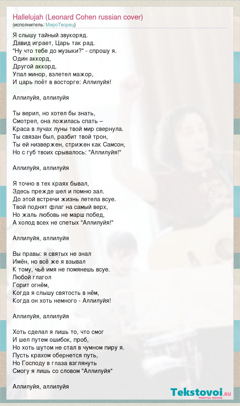 Я слышу тайный звукоряд. Давид играет, Царь так рад. "Ну что тебе до музыки?" - спрошу я. Один аккорд, Другой аккорд, Упал минор, взлетел мажор, И царь поёт в восторге: Аллилуйя! Аллилуйя, аллилуйя Ты верил, но хотел бы знать, Смотрел, она ложилась спать – Краса в лучах луны твой мир свернула. Ты связан был, разбит твой трон, Ты ей низвержен, стрижен как Самсон, Но с губ твоих срывалось: "Аллилуйя!" Аллилуйя, аллилуйя Я точно в тех краях бывал, Здесь прежде шел и помню зал. До этой встречи жизнь летела всуе. Твой поднят флаг на самый верх, Но жаль любовь не марш побед, А холод всех не спетых "Аллилуйя!" Аллилуйя, аллилуйя Вы правы: я святых не знал Имён, но всё же я взывал К тому, чьё имя не помянешь всуе. Любой глагол Горит огнём, Когда я слышу святость в нём, Когда он хоть немного - Аллилуйя! Аллилуйя, аллилуйя Хоть сделал я лишь то, что смог И шел путем ошибок, проб, Но хоть шутом не стал в чумном пиру я. Пусть крахом обернется путь, Но Господу в глаза взглянуть Смогу я лишь со словом "Аллилуйя" Аллилуйя, аллилуйя