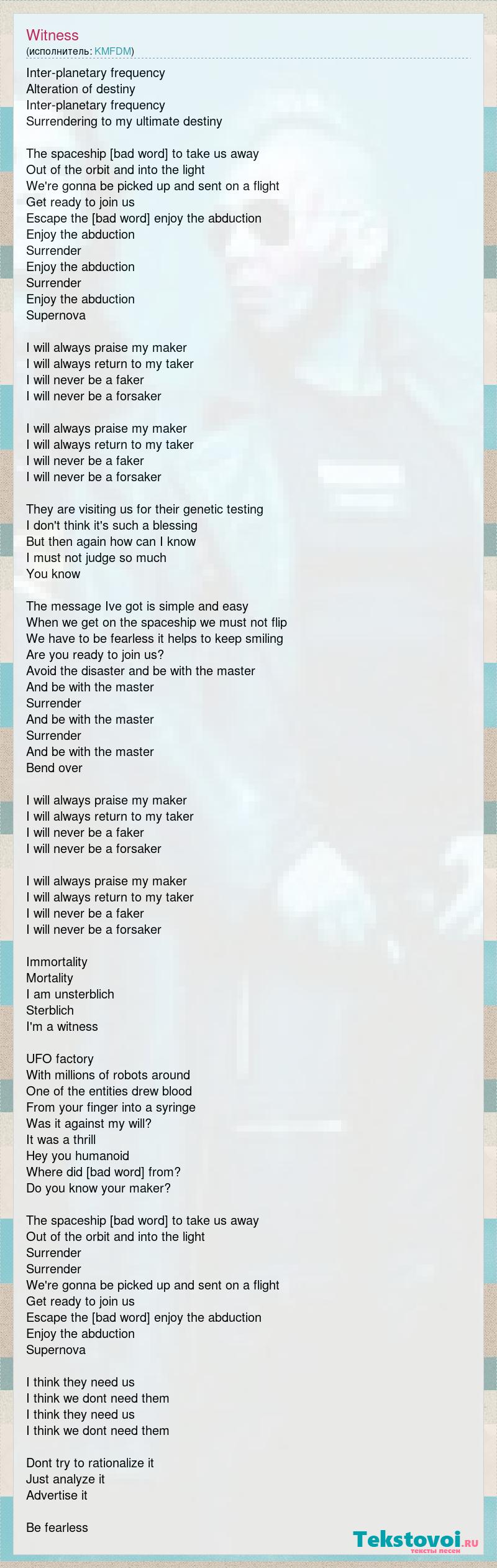 Inter-planetary frequency Alteration of destiny Inter-planetary frequency Surrendering to my ultimate destiny The spaceship will come to take us away Out of the orbit and into the light We're gonna be picked up and sent on a flight Get ready to join us Escape the destruction enjoy the abduction Enjoy the abduction Surrender Enjoy the abduction Surrender Enjoy the abduction Supernova I will always praise my maker I will always return to my taker I will never be a faker I will never be a forsaker I will always praise my maker I will always return to my taker I will never be a faker I will never be a forsaker They are visiting us for their genetic testing I don't think it's such a blessing But then again how can I know I must not judge so much You know The message Ive got is simple and easy When we get on the spaceship we must not flip We have to be fearless it helps to keep smiling Are you ready to join us? Avoid the disaster and be with the master And be with the master Surrender And be with the master Surrender And be with the master Bend over I will always praise my maker I will always return to my taker I will never be a faker I will never be a forsaker I will always praise my maker I will always return to my taker I will never be a faker I will never be a forsaker Immortality Mortality I am unsterblich Sterblich I'm a witness UFO factory With millions of robots around One of the entities drew blood From your finger into a syringe Was it against my will? It was a thrill Hey you humanoid Where did you come from? Do you know your maker? The spaceship will come to take us away Out of the orbit and into the light Surrender Surrender We're gonna be picked up and sent on a flight Get ready to join us Escape the destruction enjoy the abduction Enjoy the abduction Supernova I think they need us I think we dont need them I think they need us I think we dont need them Dont try to rationalize it Just analyze it Advertise it Be fearless