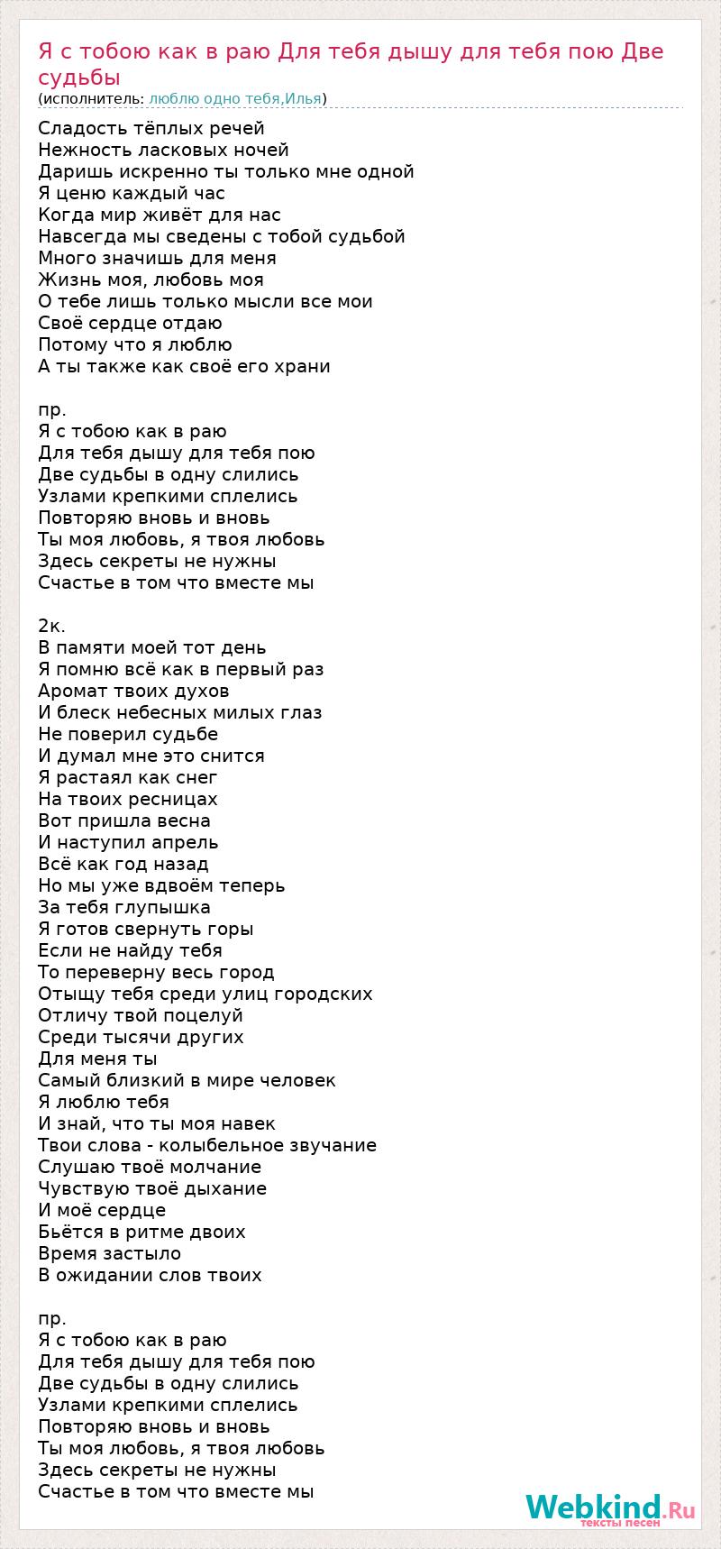 Сладость тёплых речей Нежность ласковых ночей Даришь искренно ты только мне одной Я ценю каждый час Когда мир живёт для нас Навсегда мы сведены с тобой судьбой Много значишь для меня Жизнь моя, любовь моя О тебе лишь только мысли все мои Своё сердце отдаю Потому что я люблю А ты также как своё его храни пр. Я с тобою как в раю Для тебя дышу для тебя пою Две судьбы в одну слились Узлами крепкими сплелись Повторяю вновь и вновь Ты моя любовь, я твоя любовь Здесь секреты не нужны Счастье в том что вместе мы 2к. В памяти моей тот день Я помню всё как в первый раз Аромат твоих духов И блеск небесных милых глаз Не поверил судьбе И думал мне это снится Я растаял как снег На твоих ресницах Вот пришла весна И наступил апрель Всё как год назад Но мы уже вдвоём теперь За тебя глупышка Я готов свернуть горы Если не найду тебя То переверну весь город Отыщу тебя среди улиц городских Отличу твой поцелуй Среди тысячи других Для меня ты Самый близкий в мире человек Я люблю тебя И знай, что ты моя навек Твои слова - колыбельное звучание Слушаю твоё молчание Чувствую твоё дыхание И моё сердце Бьётся в ритме двоих Время застыло В ожидании слов твоих пр. Я с тобою как в раю Для тебя дышу для тебя пою Две судьбы в одну слились Узлами крепкими сплелись Повторяю вновь и вновь Ты моя любовь, я твоя любовь Здесь секреты не нужны Счастье в том что вместе мы