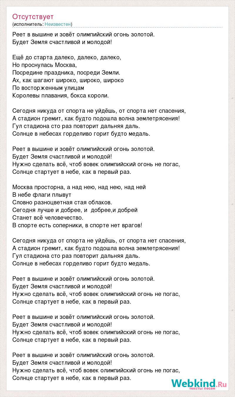 Реет в вышине и зовёт олимпийский огонь золотой. Будет Земля счастливой и молодой! Ещё до старта далеко, далеко, далеко, Но проснулась Москва, Посредине праздника, посреди Земли. Ах, как шагают широко, широко, широко По восторженным улицам Королевы плавания, бокса короли. Сегодня никуда от спорта не уйдёшь, от спорта нет спасения, А стадион гремит, как будто подошла волна землетрясения! Гул стадиона сто раз повторит дальняя даль. Солнце в небесах горделиво горит будто медаль. Реет в вышине и зовёт олимпийский огонь золотой. Будет Земля счастливой и молодой! Нужно сделать всё, чтоб вовек олимпийский огонь не погас, Солнце стартует в небе, как в первый раз. Москва просторна, а над нею, над нею, над ней В небе флаги плывут Словно разноцветная стая облаков. Сегодня лучше и добрее, и добрее,и добрей Станет всё человечество. В спорте есть соперники, в спорте нет врагов! Сегодня никуда от спорта не уйдёшь, от спорта нет спасения, А стадион гремит, как будто подошла волна землетрясения! Гул стадиона сто раз повторит дальняя даль. Солнце в небесах горделиво горит будто медаль. Реет в вышине и зовёт олимпийский огонь золотой. Будет Земля счастливой и молодой! Нужно сделать всё, чтоб вовек олимпийский огонь не погас, Солнце стартует в небе, как в первый раз. Реет в вышине и зовёт олимпийский огонь золотой. Будет Земля счастливой и молодой! Нужно сделать всё, чтоб вовек олимпийский огонь не погас, Солнце стартует в небе, как в первый раз. Реет в вышине и зовёт олимпийский огонь золотой. Будет Земля счастливой и молодой! Нужно сделать всё, чтоб вовек олимпийский огонь не погас, Солнце стартует в небе, как в первый раз.