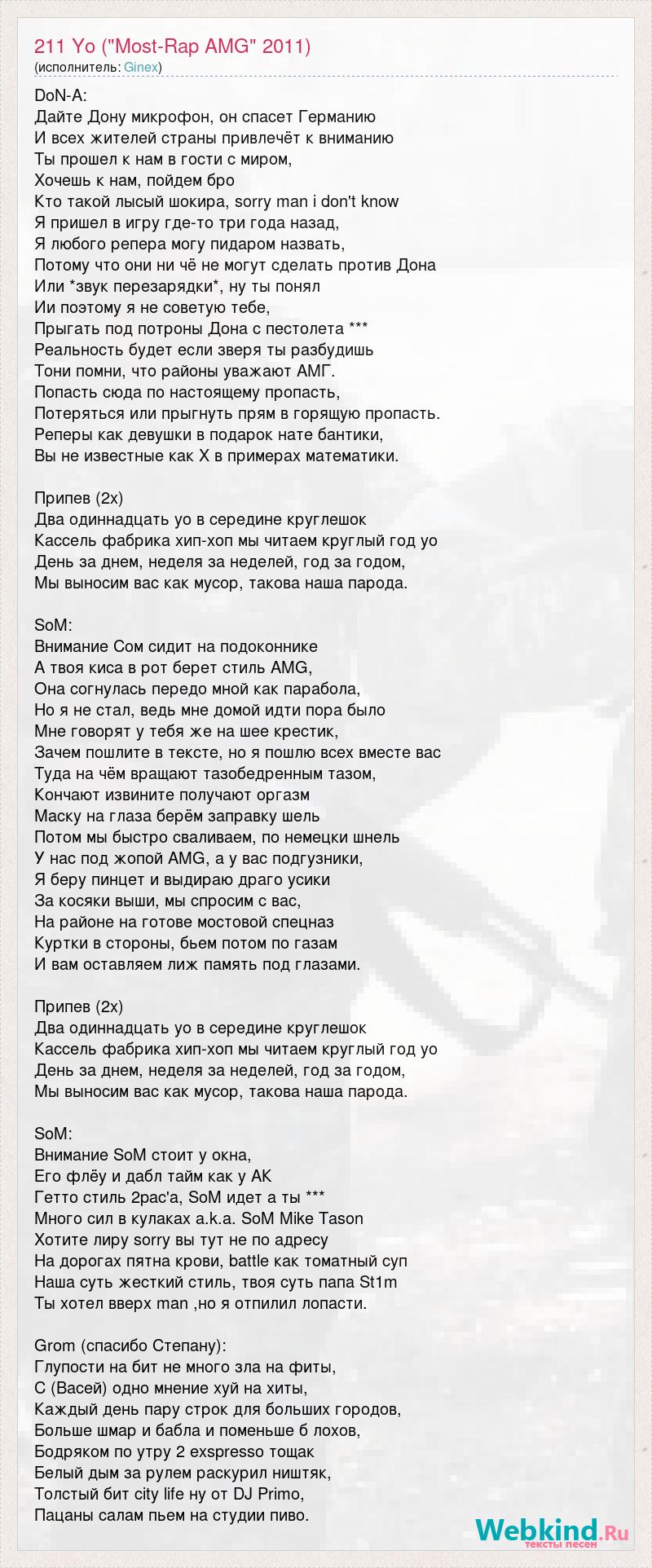 DoN-A: Дайте Дону микрофон, он спасет Германию И всех жителей страны привлечёт к вниманию Ты прошел к нам в гости с миром, Хочешь к нам, пойдем бро Кто такой лысый шокира, sorry man i don't know Я пришел в игру где-то три года назад, Я любого репера могу пидаром назвать, Потому что они ни чё не могут сделать против Дона Или *звук перезарядки*, ну ты понял Ии поэтому я не советую тебе, Прыгать под потроны Дона с пестолета *** Реальность будет если зверя ты разбудишь Тони помни, что районы уважают АМГ. Попасть сюда по настоящему пропасть, Потеряться или прыгнуть прям в горящую пропасть. Реперы как девушки в подарок нате бантики, Вы не известные как Х в примерах математики. Припев (2х) Два одиннадцать yo в середине круглешок Кассель фабрика хип-хоп мы читаем круглый год yo День за днем, неделя за неделей, год за годом, Мы выносим вас как мусор, такова наша парода. SoM: Внимание Сом сидит на подоконнике А твоя киса в рот берет стиль AMG, Она согнулась передо мной как парабола, Но я не стал, ведь мне домой идти пора было Мне говорят у тебя же на шее крестик, Зачем пошлите в тексте, но я пошлю всех вместе вас Туда на чём вращают тазобедренным тазом, Кончают извините получают оргазм Маску на глаза берём заправку шель Потом мы быстро сваливаем, по немецки шнель У нас под жопой AMG, а у вас подгузники, Я беру пинцет и выдираю драго усики За косяки выши, мы спросим с вас, На районе на готове мостовой спецназ Куртки в стороны, бьем потом по газам И вам оставляем лиж память под глазами. Припев (2х) Два одиннадцать yo в середине круглешок Кассель фабрика хип-хоп мы читаем круглый год yo День за днем, неделя за неделей, год за годом, Мы выносим вас как мусор, такова наша парода. SoM: Внимание SoM стоит у окна, Его флёу и дабл тайм как у АК Гетто стиль 2pac'a, SoM идет а ты *** Много сил в кулаках a.k.a. SoM Mike Tason Хотите лиру sorry вы тут не по адресу На дорогах пятна крови, battle как томатный суп Наша суть жесткий стиль, твоя суть папа St1m Ты хотел вверх man ,но я отпилил лопасти. Grom (спасибо Степану): Глупости на бит не много зла на фиты, С (Васей) одно мнение хуй на хиты, Каждый день пару строк для больших городов, Больше шмар и бабла и поменьше б лохов, Бодряком по утру 2 exspresso тощак Белый дым за рулем раскурил ништяк, Толстый бит city life ну от DJ Primo, Пацаны салам пьем на студии пиво.