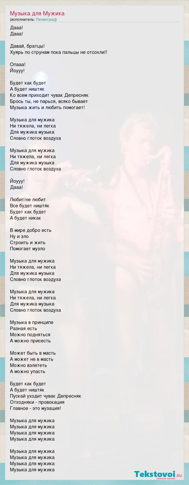 Дааа! Дааа! Давай, братцы! Хуярь по струнам пока пальцы не отсохли!! Опааа! Йоууу! Будет как будет А будет ништяк Ко всем приходит чувак Депресняк Брось ты, не парься, всяко бывает Музыка жить и любить помогает! Музыка для мужика Ни тяжела, ни легка Для мужика музыка Словно глоток воздуха Музыка для мужика Ни тяжела, ни легка Для мужика музыка Словно глоток воздуха Йоууу! Дааа! Любит/не любит Все будет ништяк Будет как будет А будет никак В мире добро есть Ну и зло Строить и жить Помогает музло Музыка для мужика Ни тяжела, ни легка Для мужика музыка Словно глоток воздуха Музыка для мужика Ни тяжела, ни легка Для мужика музыка Словно глоток воздуха Музыка в принципе Разная есть Можно подняться А можно присесть Может быть в масть А может не в масть Можно взлететь А можно упасть Будет как будет А будет ништяк Пускай уходит чувак Депресняк Отходняки - провокация Главное - это музация! Музыка для мужика Музыка для мужика Музыка для мужика Музыка для мужика Музыка для мужика Музыка для мужика Музыка для мужика Музыка для мужика