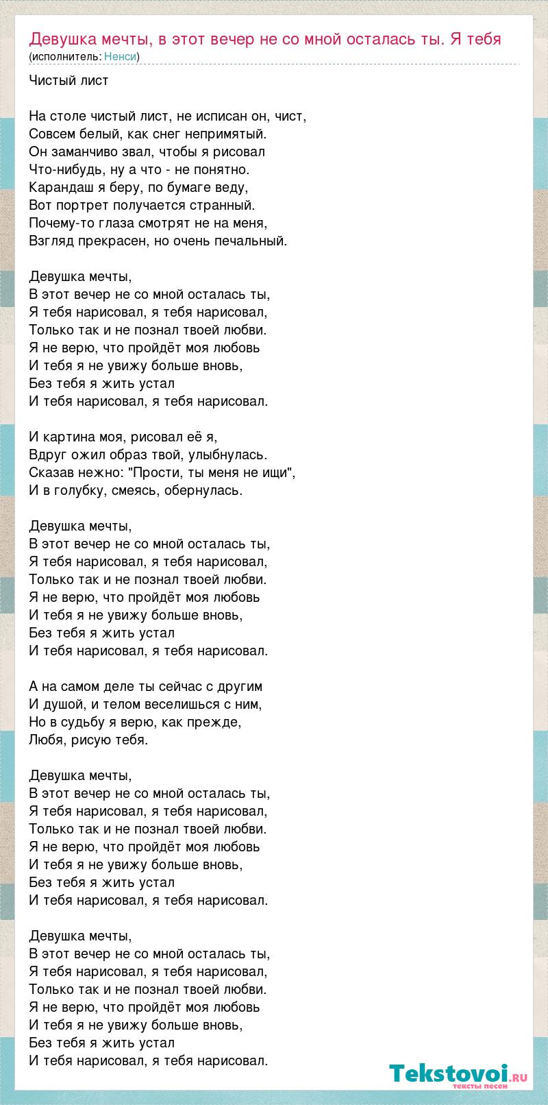 Главная→Исполнители→Ненси→Девушка мечты, в этот вечер не со мной осталась ты. Я тебя нарисовал... только т