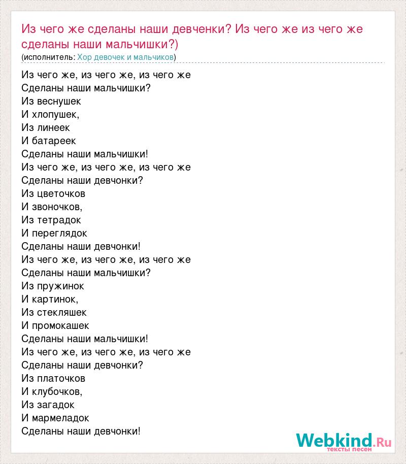 Из чего же, из чего же, из чего же Сделаны наши мальчишки? Из веснушек И хлопушек, Из линеек И батареек Сделаны наши мальчишки! Из чего же, из чего же, из чего же Сделаны наши девчонки? Из цветочков И звоночков, Из тетрадок И переглядок Сделаны наши девчонки! Из чего же, из чего же, из чего же Сделаны наши мальчишки? Из пружинок И картинок, Из стекляшек И промокашек Сделаны наши мальчишки! Из чего же, из чего же, из чего же Сделаны наши девчонки? Из платочков И клубочков, Из загадок И мармеладок Сделаны наши девчонки!