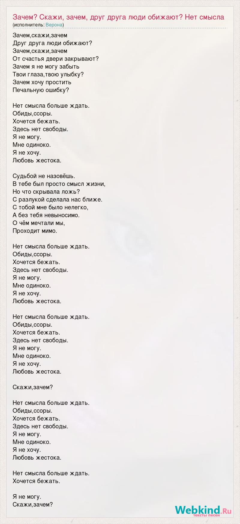 Зачем,скажи,зачем Друг друга люди обижают? Зачем,скажи,зачем От счастья двери закрывают? Зачем я не могу забыть Твои глаза,твою улыбку? Зачем хочу простить Печальную ошибку? Нет смысла больше ждать. Обиды,ссоры. Хочется бежать. Здесь нет свободы. Я не могу. Мне одиноко. Я не хочу. Любовь жестока. Судьбой не назовёшь. В тебе был просто смысл жизни, Но что скрывала ложь? С разлукой сделала нас ближе. С тобой мне было нелегко, А без тебя невыносимо. О чём мечтали мы, Проходит мимо. Нет смысла больше ждать. Обиды,ссоры. Хочется бежать. Здесь нет свободы. Я не могу. Мне одиноко. Я не хочу. Любовь жестока. Нет смысла больше ждать. Обиды,ссоры. Хочется бежать. Здесь нет свободы. Я не могу. Мне одиноко. Я не хочу. Любовь жестока. Скажи,зачем? Нет смысла больше ждать. Обиды,ссоры. Хочется бежать. Здесь нет свободы. Я не могу. Мне одиноко. Я не хочу. Любовь жестока. Нет смысла больше ждать. Хочется бежать. Я не могу. Скажи,зачем?