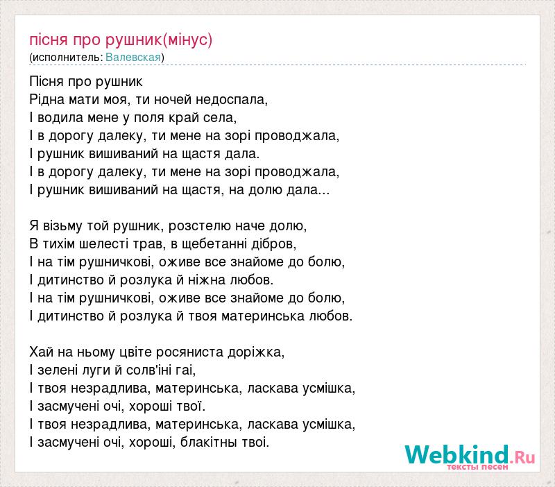 Пiсня про рушник Рідна мати моя, ти ночей недоспала, І водила мене у поля край села, І в дорогу далеку, ти мене на зорі проводжала, І рушник вишиваний на щастя дала. І в дорогу далеку, ти мене на зорі проводжала, І рушник вишиваний на щастя, на долю дала... Я візьму той рушник, розстелю наче долю, В тихім шелесті трав, в щебетанні дібров, І на тім рушничкові, оживе все знайоме до болю, І дитинство й розлука й нiжна любов. І на тім рушничкові, оживе все знайоме до болю, І дитинство й розлука й твоя материнська любов. Хай на ньому цвіте росяниста доріжка, І зелені луги й солв'iні гаi, І твоя незрадлива, материнська, ласкава усмішка, І засмучені очі, хороші твої. І твоя незрадлива, материнська, ласкава усмішка, І засмучені очі, хороші, блакiтны твоi.
