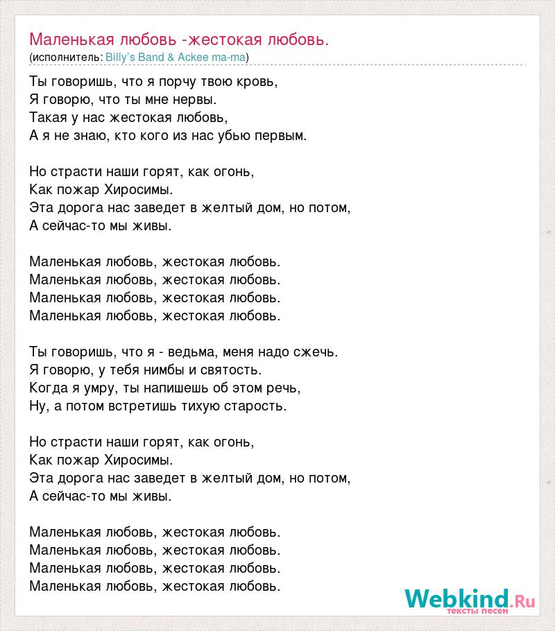 Ты говоришь, что я порчу твою кровь, Я говорю, что ты мне нервы. Такая у нас жестокая любовь, А я не знаю, кто кого из нас убью первым. Но страсти наши горят, как огонь, Как пожар Хиросимы. Эта дорога нас заведет в желтый дом, но потом, А сейчас-то мы живы. Маленькая любовь, жестокая любовь. Маленькая любовь, жестокая любовь. Маленькая любовь, жестокая любовь. Маленькая любовь, жестокая любовь. Ты говоришь, что я - ведьма, меня надо сжечь. Я говорю, у тебя нимбы и святость. Когда я умру, ты напишешь об этом речь, Ну, а потом встретишь тихую старость. Но страсти наши горят, как огонь, Как пожар Хиросимы. Эта дорога нас заведет в желтый дом, но потом, А сейчас-то мы живы. Маленькая любовь, жестокая любовь. Маленькая любовь, жестокая любовь. Маленькая любовь, жестокая любовь. Маленькая любовь, жестокая любовь.