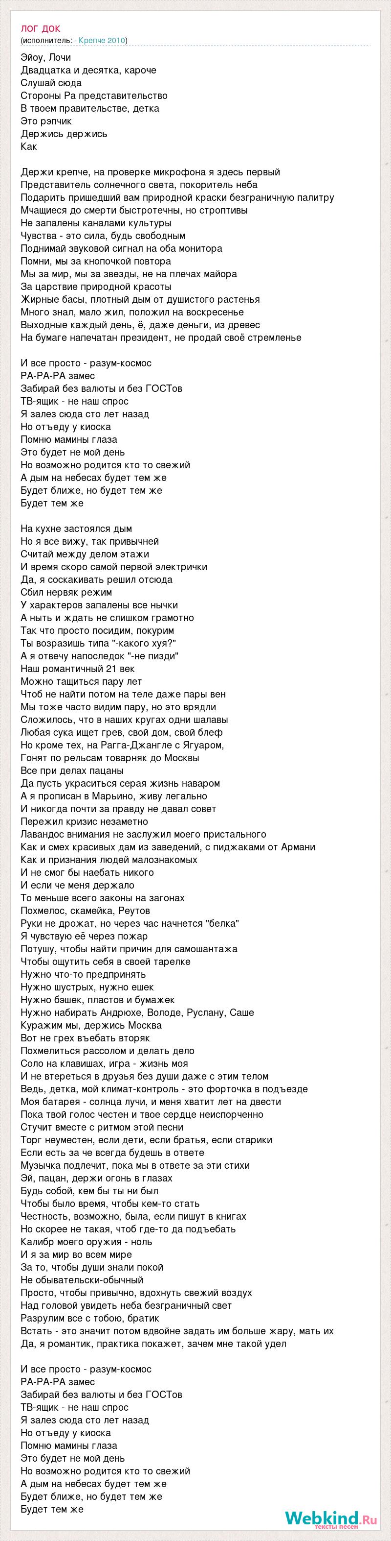 Эйоу, Лочи Двадцатка и десятка, кароче Слушай сюда Стороны Ра представительство В твоем правительстве, детка Это рэпчик Держись держись Как Держи крепче, на проверке микрофона я здесь первый Представитель солнечного света, покоритель неба Подарить пришедший вам природной краски безграничную палитру Мчащиеся до смерти быстротечны, но строптивы Не запалены каналами культуры Чувства - это сила, будь свободным Поднимай звуковой сигнал на оба монитора Помни, мы за кнопочкой повтора Мы за мир, мы за звезды, не на плечах майора За царствие природной красоты Жирные басы, плотный дым от душистого растенья Много знал, мало жил, положил на воскресенье Выходные каждый день, ё, даже деньги, из древес На бумаге напечатан президент, не продай своё стремленье И все просто - разум-космос РА-РА-РА замес Забирай без валюты и без ГОСТов ТВ-ящик - не наш спрос Я залез сюда сто лет назад Но отъеду у киоска Помню мамины глаза Это будет не мой день Но возможно родится кто то свежий А дым на небесах будет тем же Будет ближе, но будет тем же Будет тем же На кухне застоялся дым Но я все вижу, так привычней Считай между делом этажи И время скоро самой первой электрички Да, я соскакивать решил отсюда Сбил нервяк режим У характеров запалены все нычки А ныть и ждать не слишком грамотно Так что просто посидим, покурим Ты возразишь типа "-какого хуя?" А я отвечу напоследок "-не пизди" Наш романтичный 21 век Можно тащиться пару лет Чтоб не найти потом на теле даже пары вен Мы тоже часто видим пару, но это врядли Сложилось, что в наших кругах одни шалавы Любая сука ищет грев, свой дом, свой блеф Но кроме тех, на Рагга-Джангле с Ягуаром, Гонят по рельсам товарняк до Москвы Все при делах пацаны Да пусть украситься серая жизнь наваром А я прописан в Марьино, живу легально И никогда почти за правду не давал совет Пережил кризис незаметно Лавандос внимания не заслужил моего пристального Как и смех красивых дам из заведений, с пиджаками от Армани Как и признания людей малознакомых И не смог бы наебать никого И если че меня держало То меньше всего законы на загонах Похмелос, скамейка, Реутов Руки не дрожат, но через час начнется "белка" Я чувствую её через пожар Потушу, чтобы найти причин для самошантажа Чтобы ощутить себя в своей тарелке Нужно что-то предпринять Нужно шустрых, нужно ешек Нужно бэшек, пластов и бумажек Нужно набирать Андрюхе, Володе, Руслану, Саше Куражим мы, держись Москва Вот не грех въебать вторяк Похмелиться рассолом и делать дело Соло на клавишах, игра - жизнь моя И не втереться в друзья без души даже с этим телом Ведь, детка, мой климат-контроль - это форточка в подъезде Моя батарея - солнца лучи, и меня хватит лет на двести Пока твой голос честен и твое сердце неиспорченно Стучит вместе с ритмом этой песни Торг неуместен, если дети, если братья, если старики Если есть за че всегда будешь в ответе Музычка подлечит, пока мы в ответе за эти стихи Эй, пацан, держи огонь в глазах Будь собой, кем бы ты ни был Чтобы было время, чтобы кем-то стать Честность, возможно, была, если пишут в книгах Но скорее не такая, чтоб где-то да подъебать Калибр моего оружия - ноль И я за мир во всем мире За то, чтобы души знали покой Не обывательски-обычный Просто, чтобы привычно, вдохнуть свежий воздух Над головой увидеть неба безграничный свет Разрулим все с тобою, братик Встать - это значит потом вдвой