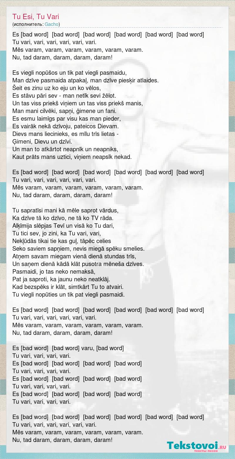 Es varu, varu, varu, varu, varu, varu. Tu vari, vari, vari, vari, vari, vari. Mēs varam, varam, varam, varam, varam, varam. Nu, tad daram, daram, daram, daram! Es viegli nopūšos un tik pat viegli pasmaidu, Man dzīve pasmaida atpakaļ, man dzīve piesķir atlaides. Šeit es zinu uz ko eju un ko vēlos, Es stāvu pāri sev - man netīk sevi žēlot. Un tas viss priekš viņiem un tas viss priekš manis, Man mani cilvēki, sapņi, ģimene un fani. Es esmu laimīgs par visu kas man pieder, Es vairāk nekā dzīvoju, pateicos Dievam. Dievs mans liecinieks, es mīlu trīs lietas - Ģimeni, Dievu un dzīvi. Un man to atkārtot neapnīk un neapniks, Kaut prāts mans uztici, viņiem neapsīk nekad. Es varu, varu, varu, varu, varu, varu. Tu vari, vari, vari, vari, vari, vari. Mēs varam, varam, varam, varam, varam, varam. Nu, tad daram, daram, daram, daram! Tu sapratīsi mani kā mēle saprot vārdus, Ka dzīve tā ko dzīvo, ne tā ko TV rāda. Alķīmija slēpjas Tevī un visā ko Tu dari, Tu tici sev, jo zini, ka Tu vari, vari, Nekļūdās tikai tie kas guļ, tāpēc celies Seko saviem sapņiem, nevis miegā spēku smelies. Atņem savam miegam vienā dienā stundas trīs, Un saņem dienā kādā klāt pusotra mēneša dzīves. Pasmaidi, jo tas neko nemaksā, Pat ja saproti, ka jaunu neko neatklāj. Kad bezspēks ir klāt, simtkārt Tu to atvairi. Tu viegli nopūties un tik pat viegli pasmaidi. Es varu, varu, varu, varu, varu, varu. Tu vari, vari, vari, vari, vari, vari. Mēs varam, varam, varam, varam, varam, varam. Nu, tad daram, daram, daram, daram! Es varu, varu varu, varu. Tu vari, vari, vari, vari. Es varu, varu, varu, varu. Tu vari, vari, vari, vari. Es varu, varu, varu, varu. Tu vari, vari, vari, vari. Es varu, varu, varu, varu. Tu vari, vari, vari, vari. Es varu, varu, varu, varu, varu, varu. Tu vari, vari, vari, vari, vari, vari. Mēs varam, varam, varam, varam, varam, varam. Nu, tad daram, daram, daram, daram!