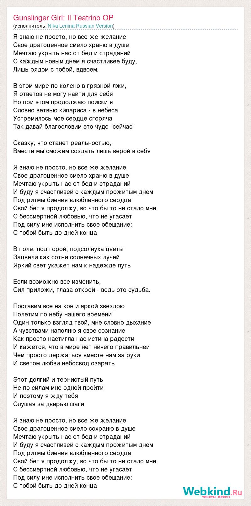Я знаю не просто, но все же желание Свое драгоценное смело храню в душе Мечтаю укрыть нас от бед и страданий С каждым новым днем я счастливее буду, Лишь рядом с тобой, вдвоем. В этом мире по колено в грязной лжи, Я ответов не могу найти для себя Но при этом продолжаю поиски я Словно ветвью кипариса - в небеса Устремилось мое сердце сгоряча Так давай благословим это чудо "сейчас" Сказку, что станет реальностью, Вместе мы сможем создать лишь верой в себя Я знаю не просто, но все же желание Свое драгоценное смело храню в душе Мечтаю укрыть нас от бед и страданий И буду я счастливей с каждым прожитым днем Под ритмы биения влюбленного сердца Свой бег я продолжу, во что бы то ни стало мне С бессмертной любовью, что не угасает Под силу мне исполнить свое обещание: С тобой быть до дней конца В поле, под горой, подсолнуха цветы Зацвели как сотни солнечных лучей Яркий свет укажет нам к надежде путь Если возможно все изменить, Сил приложи, глаза открой - ведь это судьба. Поставим все на кон и яркой звездою Полетим по небу нашего времени Один только взгляд твой, мне словно дыхание А чувствами наполню я свое сознание Как просто настигла нас истина радости И кажется, что в мире нет ничего правильней Чем просто держаться вместе нам за руки И светом любви небосвод озарять Этот долгий и тернистый путь Не по силам мне одной пройти И поэтому я жду тебя Слушая за дверью шаги Я знаю не просто, но все же желание Свое драгоценное смело сохраню в душе Мечтаю укрыть нас от бед и страданий И буду я счастливей с каждым прожитым днем Под ритмы биения влюбленного сердца Свой бег я продолжу, во что бы то ни стало мне С бессмертной любовью, что не угасает Под силу мне исполнить свое обещание: С тобой быть до дней конца