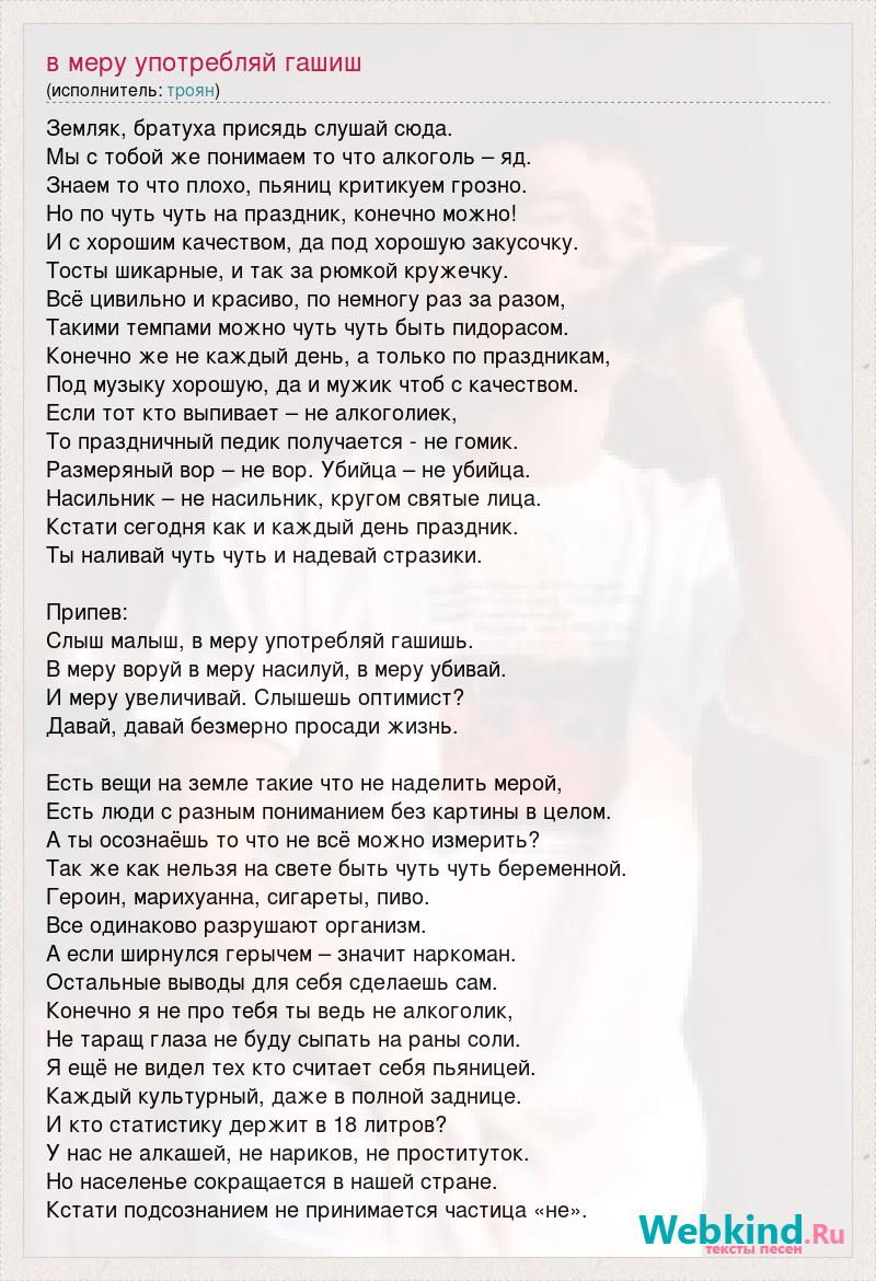 Земляк, братуха присядь слушай сюда. Мы с тобой же понимаем то что алкоголь – яд. Знаем то что плохо, пьяниц критикуем грозно. Но по чуть чуть на праздник, конечно можно! И с хорошим качеством, да под хорошую закусочку. Тосты шикарные, и так за рюмкой кружечку. Всё цивильно и красиво, по немногу раз за разом, Такими темпами можно чуть чуть быть пидорасом. Конечно же не каждый день, а только по праздникам, Под музыку хорошую, да и мужик чтоб с качеством. Если тот кто выпивает – не алкоголиек, То праздничный педик получается - не гомик. Размеряный вор – не вор. Убийца – не убийца. Насильник – не насильник, кругом святые лица. Кстати сегодня как и каждый день праздник. Ты наливай чуть чуть и надевай стразики. Припев: Слыш малыш, в меру употребляй гашишь. В меру воруй в меру насилуй, в меру убивай. И меру увеличивай. Слышешь оптимист? Давай, давай безмерно просади жизнь. Есть вещи на земле такие что не наделить мерой, Есть люди с разным пониманием без картины в целом. А ты осознаёшь то что не всё можно измерить? Так же как нельзя на свете быть чуть чуть беременной. Героин, марихуанна, сигареты, пиво. Все одинаково разрушают организм. А если ширнулся герычем – значит наркоман. Остальные выводы для себя сделаешь сам. Конечно я не про тебя ты ведь не алкоголик, Не таращ глаза не буду сыпать на раны соли. Я ещё не видел тех кто считает себя пьяницей. Каждый культурный, даже в полной заднице. И кто статистику держит в 18 литров? У нас не алкашей, не нариков, не проституток. Но населенье сокращается в нашей стране. Кстати подсознанием не принимается частица «не».
