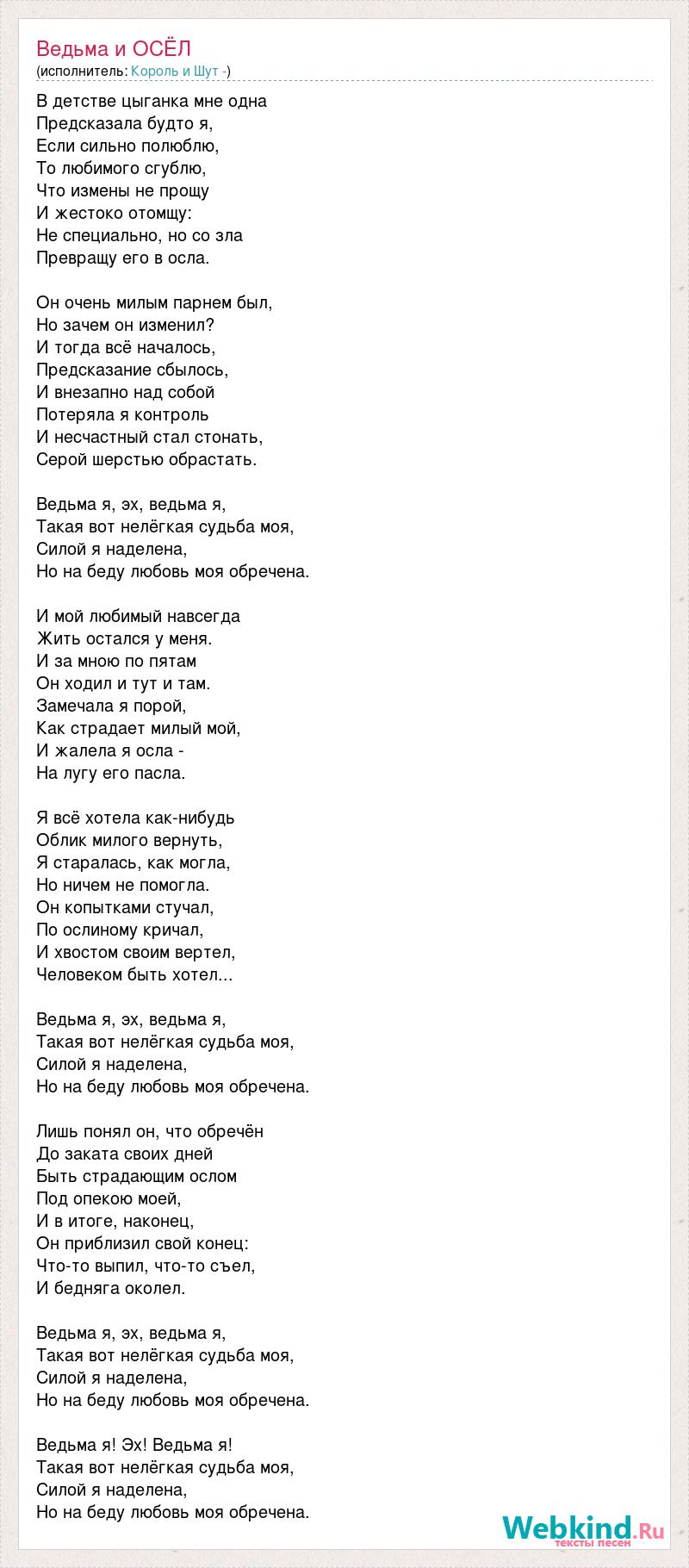 В детстве цыганка мне одна Предсказала будто я, Если сильно полюблю, То любимого сгублю, Что измены не прощу И жестоко отомщу: Не специально, но со зла Превращу его в осла. Он очень милым парнем был, Но зачем он изменил? И тогда всё началось, Предсказание сбылось, И внезапно над собой Потеряла я контроль И несчастный стал стонать, Серой шерстью обрастать. Ведьма я, эх, ведьма я, Такая вот нелёгкая судьба моя, Силой я наделена, Но на беду любовь моя обречена. И мой любимый навсегда Жить остался у меня. И за мною по пятам Он ходил и тут и там. Замечала я порой, Как страдает милый мой, И жалела я осла - На лугу его пасла. Я всё хотела как-нибудь Облик милого вернуть, Я старалась, как могла, Но ничем не помогла. Он копытками стучал, По ослиному кричал, И хвостом своим вертел, Человеком быть хотел... Ведьма я, эх, ведьма я, Такая вот нелёгкая судьба моя, Силой я наделена, Но на беду любовь моя обречена. Лишь понял он, что обречён До заката своих дней Быть страдающим ослом Под опекою моей, И в итоге, наконец, Он приблизил свой конец: Что-то выпил, что-то съел, И бедняга околел. Ведьма я, эх, ведьма я, Такая вот нелёгкая судьба моя, Силой я наделена, Но на беду любовь моя обречена. Ведьма я! Эх! Ведьма я! Такая вот нелёгкая судьба моя, Силой я наделена, Но на беду любовь моя обречена.