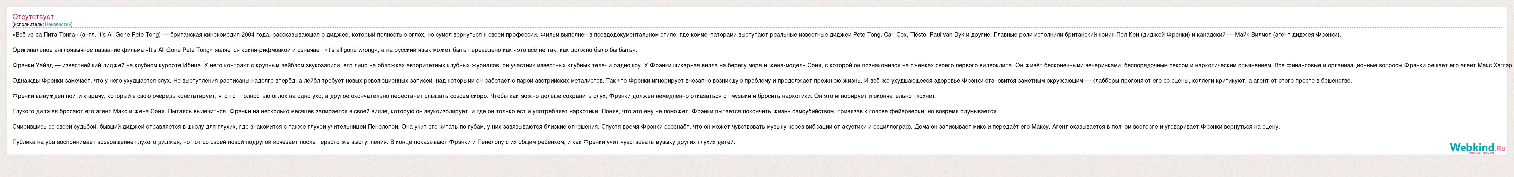 Главная→Исполнители→Неизвестен→«Всё из-за Пита Тонга» (англ. It’s All Gone Pete Tong) — британская кино