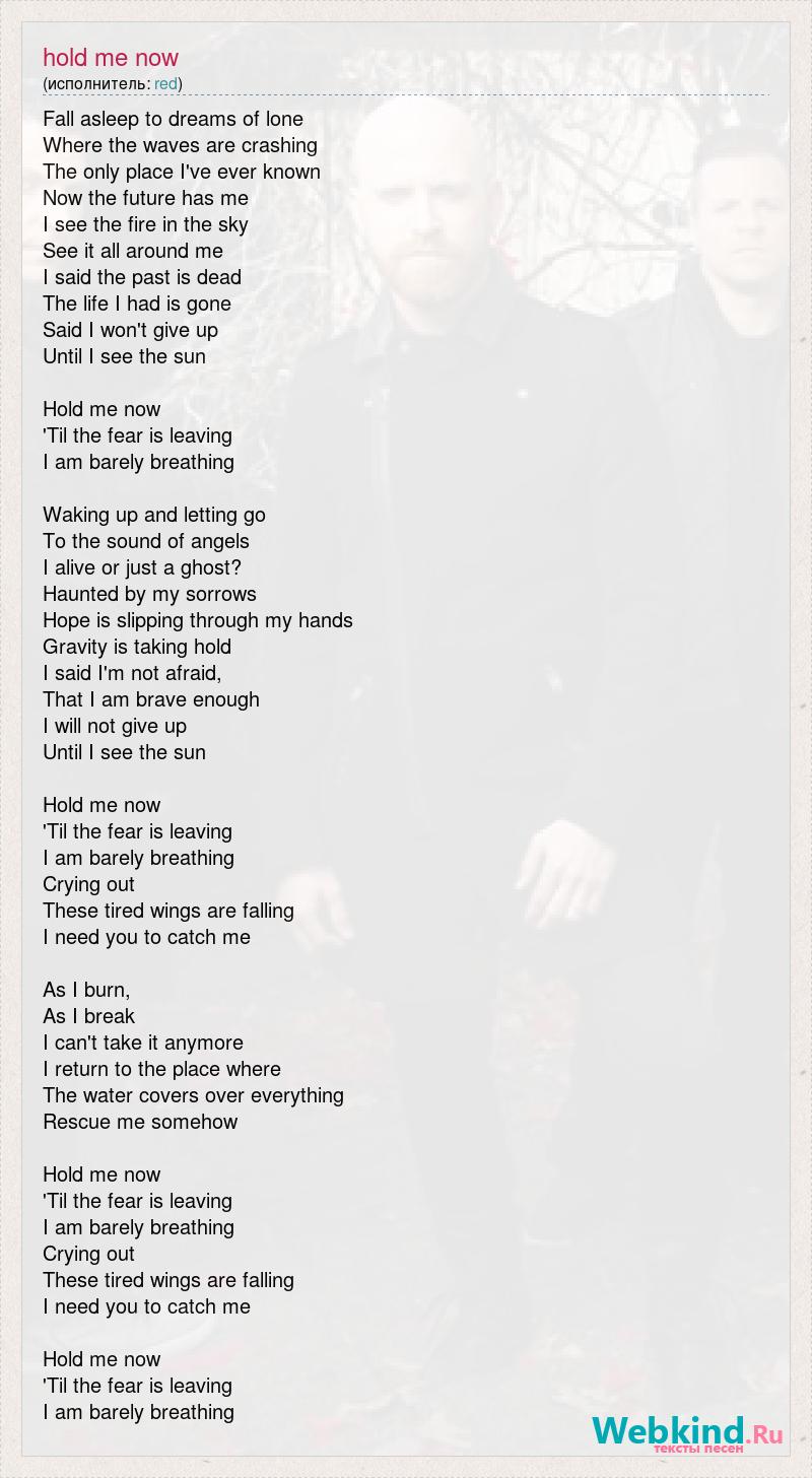 Fall asleep to dreams of lone Where the waves are crashing The only place I've ever known Now the future has me I see the fire in the sky See it all around me I said the past is dead The life I had is gone Said I won't give up Until I see the sun Hold me now 'Til the fear is leaving I am barely breathing Waking up and letting go To the sound of angels I alive or just a ghost? Haunted by my sorrows Hope is slipping through my hands Gravity is taking hold I said I'm not afraid, That I am brave enough I will not give up Until I see the sun Hold me now 'Til the fear is leaving I am barely breathing Crying out These tired wings are falling I need you to catch me As I burn, As I break I can't take it anymore I return to the place where The water covers over everything Rescue me somehow Hold me now 'Til the fear is leaving I am barely breathing Crying out These tired wings are falling I need you to catch me Hold me now 'Til the fear is leaving I am barely breathing