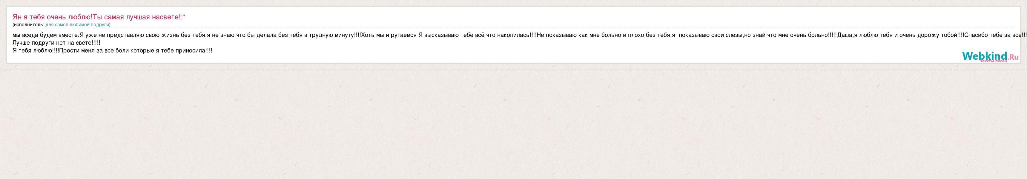 мы вседа будем вместе.Я уже не представляю свою жизнь без тебя,я не знаю что бы делала без тебя в трудную минуту!!!!Хоть мы и ругаемся Я высказываю тебе всё что накопилась!!!!Не показываю как мне больно и плохо без тебя,я показываю свои слезы,но знай что мне очень больно!!!!!Даша,я люблю тебя и очень дорожу тобой!!!!Спасибо тебе за все!!! Лучше подруги нет на свете!!!!! Я тебя люблю!!!!Прости меня за все боли которые я тебе приносила!!!!