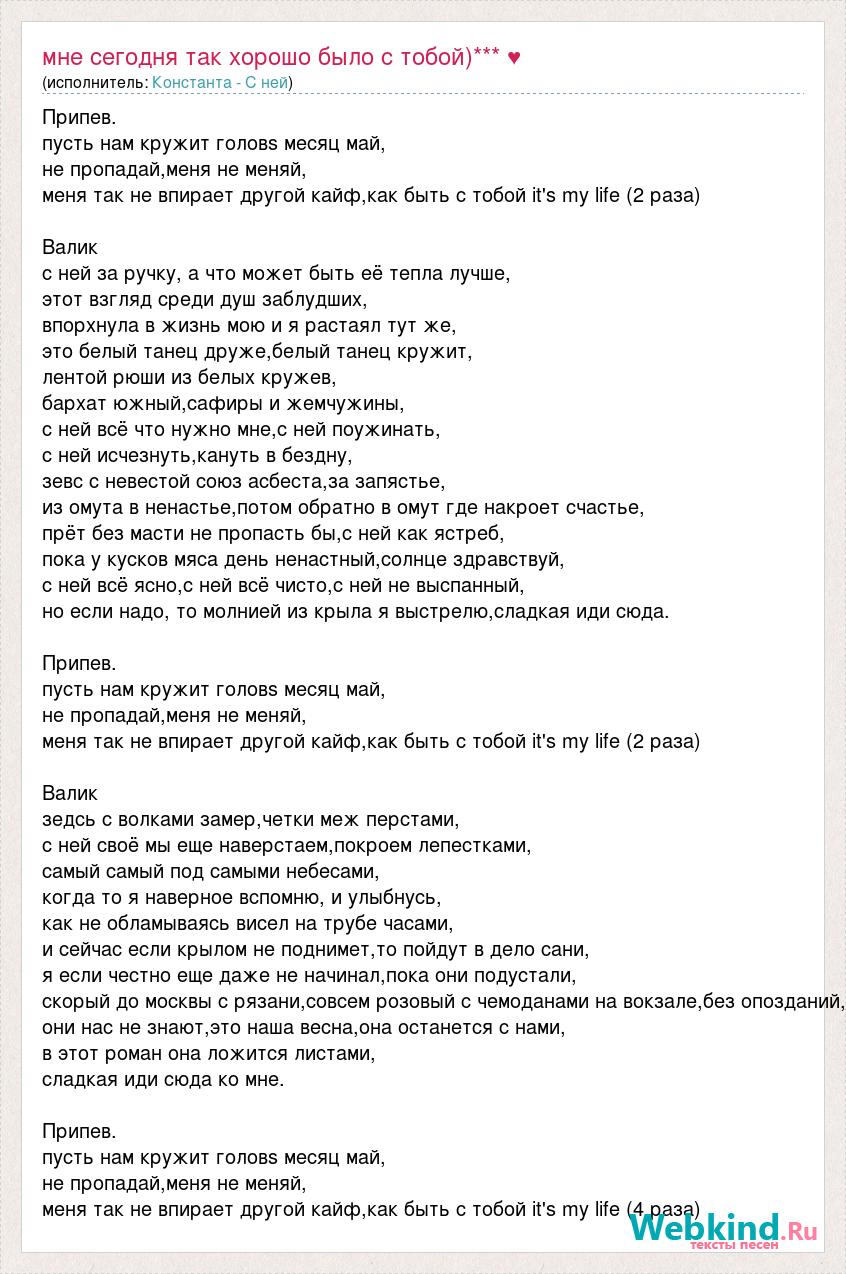 Припев. пусть нам кружит головs месяц май, не пропадай,меня не меняй, меня так не впирает другой кайф,как быть с тобой it's my life (2 раза) Валик с ней за ручку, а что может быть её тепла лучше, этот взгляд среди душ заблудших, впорхнула в жизнь мою и я растаял тут же, это белый танец друже,белый танец кружит, лентой рюши из белых кружев, бархат южный,сафиры и жемчужины, с ней всё что нужно мне,с ней поужинать, с ней исчезнуть,кануть в бездну, зевс с невестой союз асбеста,за запястье, из омута в ненастье,потом обратно в омут где накроет счастье, прёт без масти не пропасть бы,с ней как ястреб, пока у кусков мяса день ненастный,солнце здравствуй, с ней всё ясно,с ней всё чисто,с ней не выспанный, но если надо, то молнией из крыла я выстрелю,сладкая иди сюда. Припев. пусть нам кружит головs месяц май, не пропадай,меня не меняй, меня так не впирает другой кайф,как быть с тобой it's my life (2 раза) Валик зедсь с волками замер,четки меж перстами, с ней своё мы еще наверстаем,покроем лепестками, самый самый под самыми небесами, когда то я наверное вспомню, и улыбнусь, как не обламываясь висел на трубе часами, и сейчас если крылом не поднимет,то пойдут в дело сани, я если честно еще даже не начинал,пока они подустали, скорый до москвы с рязани,совсем розовый с чемоданами на вокзале,без опозданий, они нас не знают,это наша весна,она останется с нами, в этот роман она ложится листами, сладкая иди сюда ко мне. Припев. пусть нам кружит головs месяц май, не пропадай,меня не меняй, меня так не впирает другой кайф,как быть с тобой it's my life (4 раза)