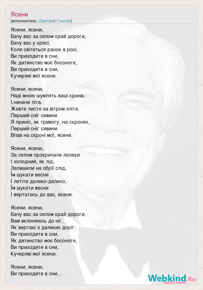 Ясени, ясени, Бачу вас за селом край дороги, Бачу вас у красі, Коли світиться ранок в росі. Ви приходите в сни, Як дитинство моє босоноге, Ви приходите в сни, Кучеряві мої ясени. Ясени, ясени, Наді мною шумлять ваші крона, І,неначе літа, Жовте листя за вітром зліта. Перший сніг сивини Я приніс, як тривогу, на скронях, Перший сніг сивини Впав на скроні мої, ясени. Ясени, ясени, За селом прокричали лелеки І холодний, як лід, Залишили на обрії слід, Їм шукати весни І летіти далеко-далеко, Їм шукати весни І вертатись до вас, ясени. Ясени, ясени, Бачу вас за селом край дороги, Вам вклоняюсь до ніг, Як вертаю з далеких доріг. Ви приходите в сни, Як дитинство моє босоноге, Ви приходите в сни, Кучеряві мої ясени. Ясени, ясени, Ви приходите в сни...