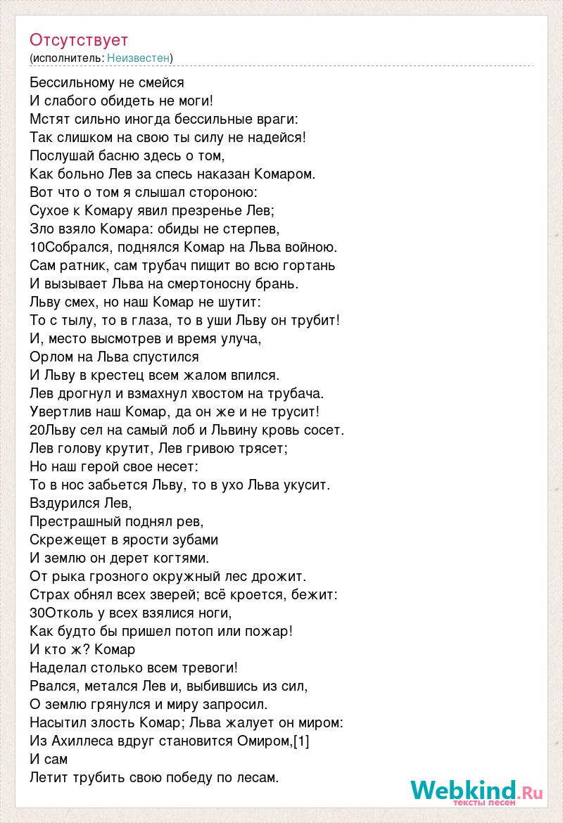 Бессильному не смейся И слабого обидеть не моги! Мстят сильно иногда бессильные враги: Так слишком на свою ты силу не надейся! Послушай басню здесь о том, Как больно Лев за спесь наказан Комаром. Вот что о том я слышал стороною: Сухое к Комару явил презренье Лев; Зло взяло Комара: обиды не стерпев, 10Собрался, поднялся Комар на Льва войною. Сам ратник, сам трубач пищит во всю гортань И вызывает Льва на смертоносну брань. Льву смех, но наш Комар не шутит: То с тылу, то в глаза, то в уши Льву он трубит! И, место высмотрев и время улуча, Орлом на Льва спустился И Льву в крестец всем жалом впился. Лев дрогнул и взмахнул хвостом на трубача. Увертлив наш Комар, да он же и не трусит! 20Льву сел на самый лоб и Львину кровь сосет. Лев голову крутит, Лев гривою трясет; Но наш герой свое несет: То в нос забьется Льву, то в ухо Льва укусит. Вздурился Лев, Престрашный поднял рев, Скрежещет в ярости зубами И землю он дерет когтями. От рыка грозного окружный лес дрожит. Страх обнял всех зверей; всё кроется, бежит: 30Отколь у всех взялися ноги, Как будто бы пришел потоп или пожар! И кто ж? Комар Наделал столько всем тревоги! Рвался, метался Лев и, выбившись из сил, О землю грянулся и миру запросил. Насытил злость Комар; Льва жалует он миром: Из Ахиллеса вдруг становится Омиром,[1] И сам Летит трубить свою победу по лесам.