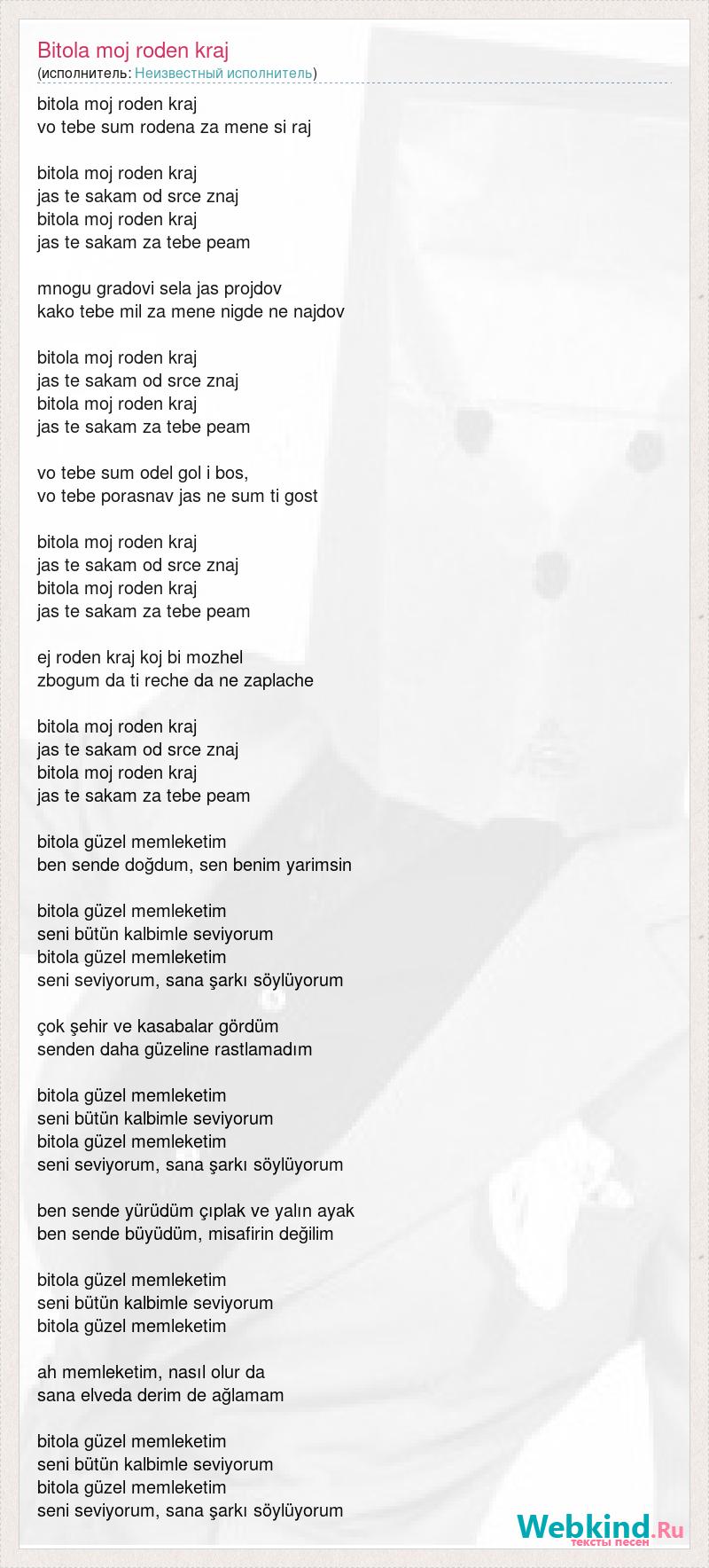 bitola moj roden kraj vo tebe sum rodena za mene si raj bitola moj roden kraj jas te sakam od srce znaj bitola moj roden kraj jas te sakam za tebe peam mnogu gradovi sela jas projdov kako tebe mil za mene nigde ne najdov bitola moj roden kraj jas te sakam od srce znaj bitola moj roden kraj jas te sakam za tebe peam vo tebe sum odel gol i bos, vo tebe porasnav jas ne sum ti gost bitola moj roden kraj jas te sakam od srce znaj bitola moj roden kraj jas te sakam za tebe peam ej roden kraj koj bi mozhel zbogum da ti reche da ne zaplache bitola moj roden kraj jas te sakam od srce znaj bitola moj roden kraj jas te sakam za tebe peam bitola güzel memleketim ben sende doğdum, sen benim yarimsin bitola güzel memleketim seni bütün kalbimle seviyorum bitola güzel memleketim seni seviyorum, sana şarkı söylüyorum çok şehir ve kasabalar gördüm senden daha güzeline rastlamadım bitola güzel memleketim seni bütün kalbimle seviyorum bitola güzel memleketim seni seviyorum, sana şarkı söylüyorum ben sende yürüdüm çıplak ve yalın ayak ben sende büyüdüm, misafirin değilim bitola güzel memleketim seni bütün kalbimle seviyorum bitola güzel memleketim ah memleketim, nasıl olur da sana elveda derim de ağlamam bitola güzel memleketim seni bütün kalbimle seviyorum bitola güzel memleketim seni seviyorum, sana şarkı söylüyorum