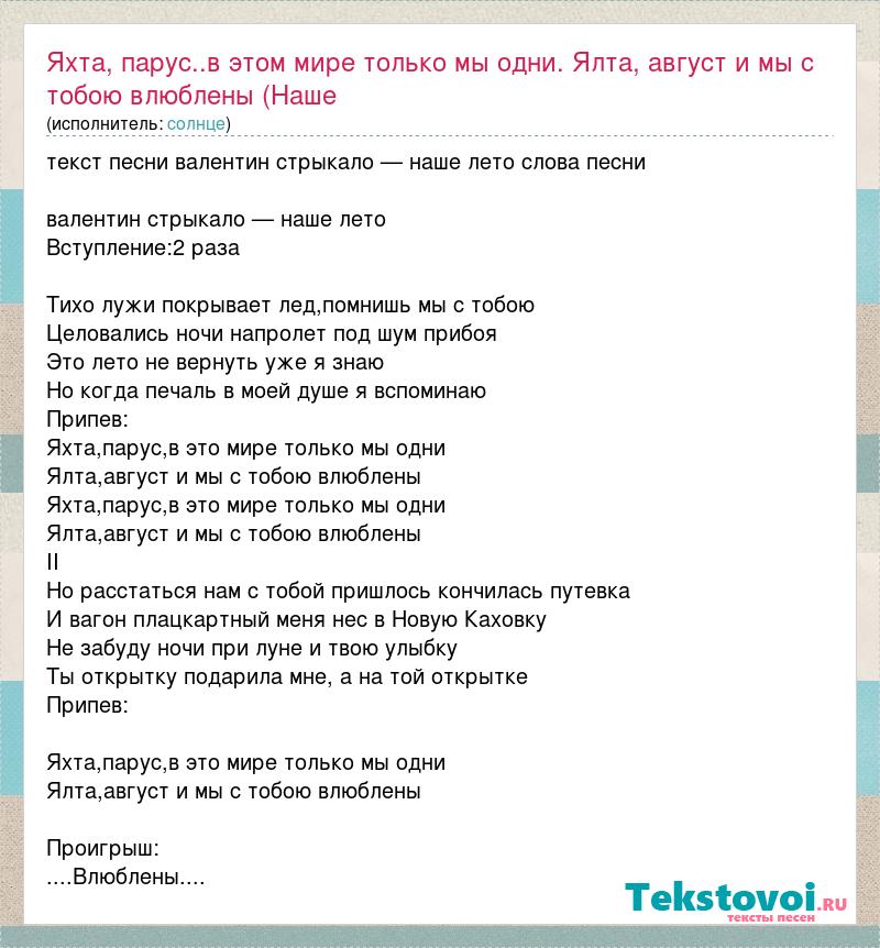 текст песни валентин стрыкало — наше лето слова песни валентин стрыкало — наше лето Вступление:2 раза Тихо лужи покрывает лед,помнишь мы с тобою Целовались ночи напролет под шум прибоя Это лето не вернуть уже я знаю Но когда печаль в моей душе я вспоминаю Припев: Яхта,парус,в это мире только мы одни Ялта,август и мы с тобою влюблены Яхта,парус,в это мире только мы одни Ялта,август и мы с тобою влюблены II Но расстаться нам с тобой пришлось кончилась путевка И вагон плацкартный меня нес в Новую Каховку Не забуду ночи при луне и твою улыбку Ты открытку подарила мне, а на той открытке Припев: Яхта,парус,в это мире только мы одни Ялта,август и мы с тобою влюблены Проигрыш: ....Влюблены....
