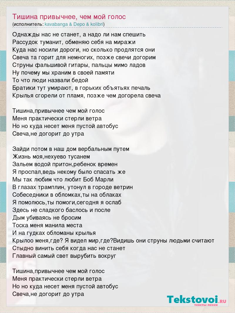 Однажды нас не станет, а надо ли нам спешить Рассудок туманит, обменяю себя на миражи Куда нас носили дороги, но сколько продлятся они Свеча та горит для немногих, позже свечи догорим Струны фальшивой гитары, пальцы мимо ладов Ну почему мы храним в своей памяти То что люди назвали бедой Братики тут умирают, в горьких объятьях печаль Крылья сгорели от пламя, позже чем догорела свеча Тишина,привычнее чем мой голос Меня практически стерли ветра Но но куда несет меня пустой автобус Свеча,не догорит до утра Зайди потом в наш дом вербальным путем Жизнь моя,нехуево тусанем Зальем водой притон,ребенок времен Я проспал,ведь некому было спасать же Мы так любим что любит Боб Марли В глазах трамплин, утонул в городе ветрин Собеседники в обломках,ты на облаках Я помолюсь,ты помоги,сегодня я ослаб Здесь не сладкого баслось и после Дым убиваясь не бросим Тоска меня манила места И на гудках обломаны крылья Крылоо меня,где? Я видел мир,где?Видишь они струны людьми считают Стыдно винить себя когда нас не станет Главный самый свет вырубить вокруг Тишина,привычнее чем мой голос Меня практически стерли ветра Но но куда несет меня пустой автобус Свеча,не догорит до утра