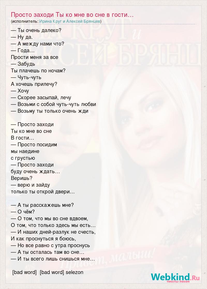— Ты очень далеко? — Ну да. — А между нами что? — Года… Прости меня за все — Забудь Ты плачешь по ночам? — Чуть-чуть А хочешь прилечу? — Хочу — Скорее засыпай, лечу — Возьми с собой чуть-чуть любви — Возьму ты только очень жди — Просто заходи Ты ко мне во сне В гости… — Просто посидим мы наедине с грустью — Просто заходи буду очень ждать… Веришь? — верю и зайду только ты открой двери… — А ты расскажешь мне? — О чём? — О том, что мы во сне вдвоем, О том, что только здесь мы есть… — И наших дней-разлук не счесть, И как проснуться я боюсь, — Но все равно с утра проснусь — А ты осталась там во сне… — И ты всего лишь снишься мне… [bad word] [bad word] selezon