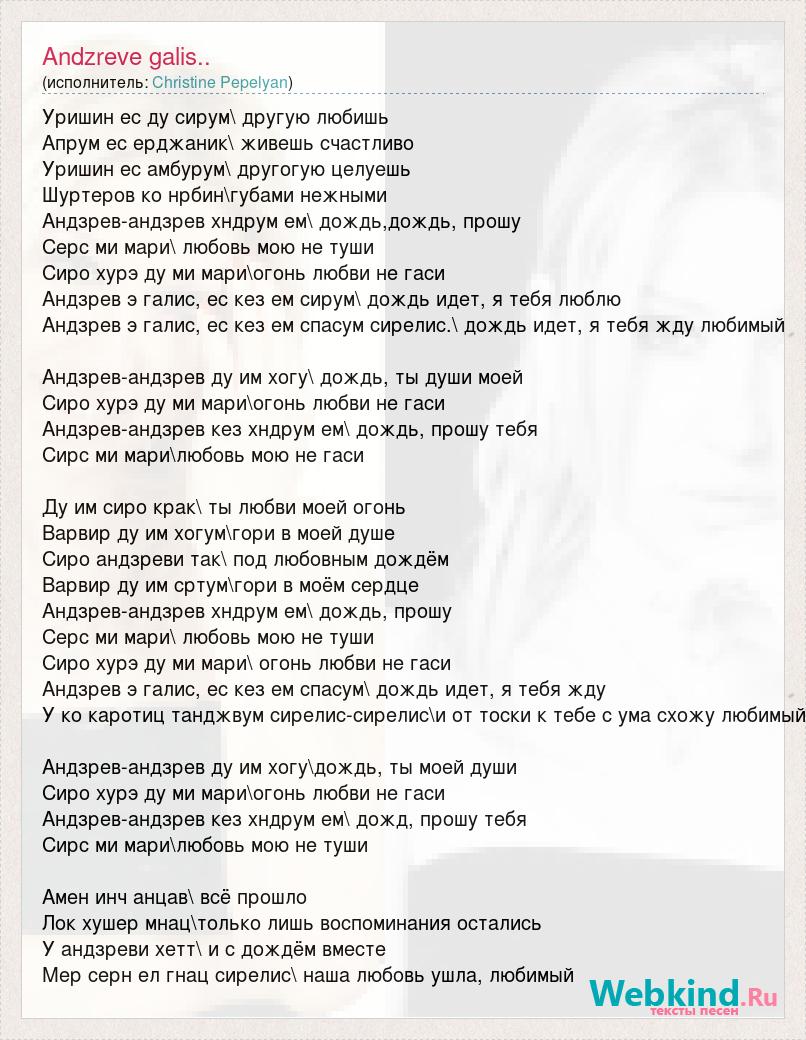 Уришин ес ду сирум\ другую любишь Апрум ес ерджаник\ живешь счастливо Уришин ес амбурум\ другогую целуешь Шуртеров ко нрбин\губами нежными Андзрев-андзрев хндрум ем\ дождь,дождь, прошу Серс ми мари\ любовь мою не туши Сиро хурэ ду ми мари\огонь любви не гаси Андзрев э галис, ес кез ем сирум\ дождь идет, я тебя люблю Андзрев э галис, ес кез ем спасум сирелис.\ дождь идет, я тебя жду любимый Андзрев-андзрев ду им хогу\ дождь, ты души моей Сиро хурэ ду ми мари\огонь любви не гаси Андзрев-андзрев кез хндрум ем\ дождь, прошу тебя Сирс ми мари\любовь мою не гаси Ду им сиро крак\ ты любви моей огонь Варвир ду им хогум\гори в моей душе Сиро андзреви так\ под любовным дождём Варвир ду им сртум\гори в моём сердце Андзрев-андзрев хндрум ем\ дождь, прошу Серс ми мари\ любовь мою не туши Сиро хурэ ду ми мари\ огонь любви не гаси Андзрев э галис, ес кез ем спасум\ дождь идет, я тебя жду У ко каротиц танджвум сирелис-сирелис\и от тоски к тебе с ума схожу любимый Андзрев-андзрев ду им хогу\дождь, ты моей души Сиро хурэ ду ми мари\огонь любви не гаси Андзрев-андзрев кез хндрум ем\ дожд, прошу тебя Сирс ми мари\любовь мою не туши Амен инч анцав\ всё прошло Лок хушер мнац\только лишь воспоминания остались У андзреви хетт\ и с дождём вместе Мер серн ел гнац сирелис\ наша любовь ушла, любимый
