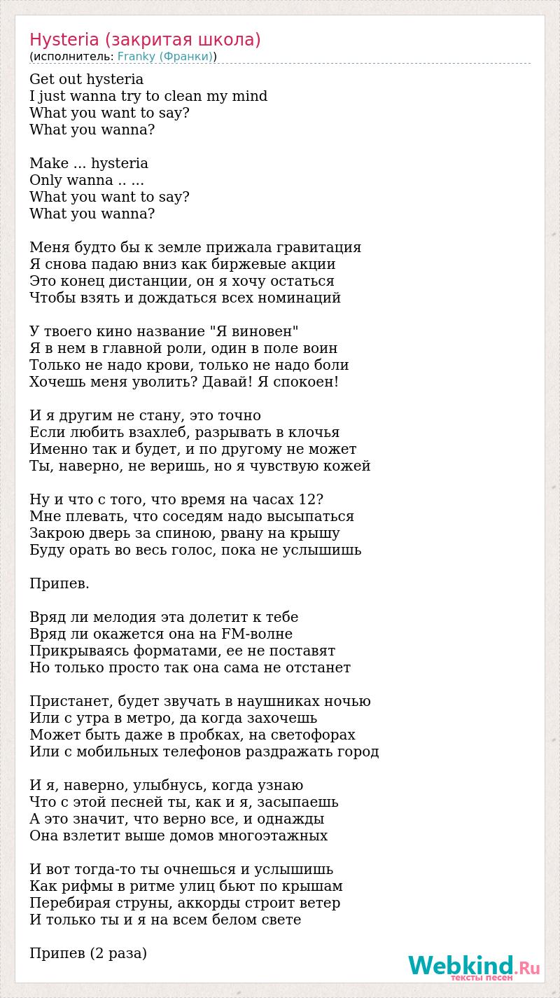 Get out hysteria I just wanna try to clean my mind What you want to say? What you wanna? Make ... hysteria Only wanna .. ... What you want to say? What you wanna? Меня будто бы к земле прижала гравитация Я снова падаю вниз как биржевые акции Это конец дистанции, он я хочу остаться Чтобы взять и дождаться всех номинаций У твоего кино название "Я виновен" Я в нем в главной роли, один в поле воин Только не надо крови, только не надо боли Хочешь меня уволить? Давай! Я спокоен! И я другим не стану, это точно Если любить взахлеб, разрывать в клочья Именно так и будет, и по другому не может Ты, наверно, не веришь, но я чувствую кожей Ну и что с того, что время на часах 12? Мне плевать, что соседям надо высыпаться Закрою дверь за спиною, рвану на крышу Буду орать во весь голос, пока не услышишь Припев. Вряд ли мелодия эта долетит к тебе Вряд ли окажется она на FM-волне Прикрываясь форматами, ее не поставят Но только просто так она сама не отстанет Пристанет, будет звучать в наушниках ночью Или с утра в метро, да когда захочешь Может быть даже в пробках, на светофорах Или с мобильных телефонов раздражать город И я, наверно, улыбнусь, когда узнаю Что с этой песней ты, как и я, засыпаешь А это значит, что верно все, и однажды Она взлетит выше домов многоэтажных И вот тогда-то ты очнешься и услышишь Как рифмы в ритме улиц бьют по крышам Перебирая струны, аккорды строит ветер И только ты и я на всем белом свете Припев (2 раза)