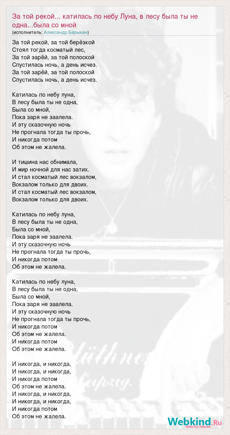 За той рекой, за той берёзкой Стоял тогда косматый лес, За той зарёй, за той полоской Спустилась ночь, а день исчез. За той зарёй, за той полоской Спустилась ночь, а день исчез. Катилась по небу луна, В лесу была ты не одна, Была со мной, Пока заря не заалела. И эту сказочную ночь Не прогнала тогда ты прочь, И никогда потом Об этом не жалела. И тишина нас обнимала, И мир ночной для нас затих. И стал косматый лес вокзалом, Вокзалом только для двоих. И стал косматый лес вокзалом, Вокзалом только для двоих. Катилась по небу луна, В лесу была ты не одна, Была со мной, Пока заря не заалела. И эту сказочную ночь Не прогнала тогда ты прочь, И никогда потом Об этом не жалела. Катилась по небу луна, В лесу была ты не одна, Была со мной, Пока заря не заалела. И эту сказочную ночь Не прогнала тогда ты прочь, И никогда потом Об этом не жалела. И никогда потом Об этом не жалела. И никогда, и никогда, И никогда, и никогда, И никогда потом Об этом не жалела. И никогда, и никогда, И никогда, и никогда, И никогда потом Об этом не жалела.