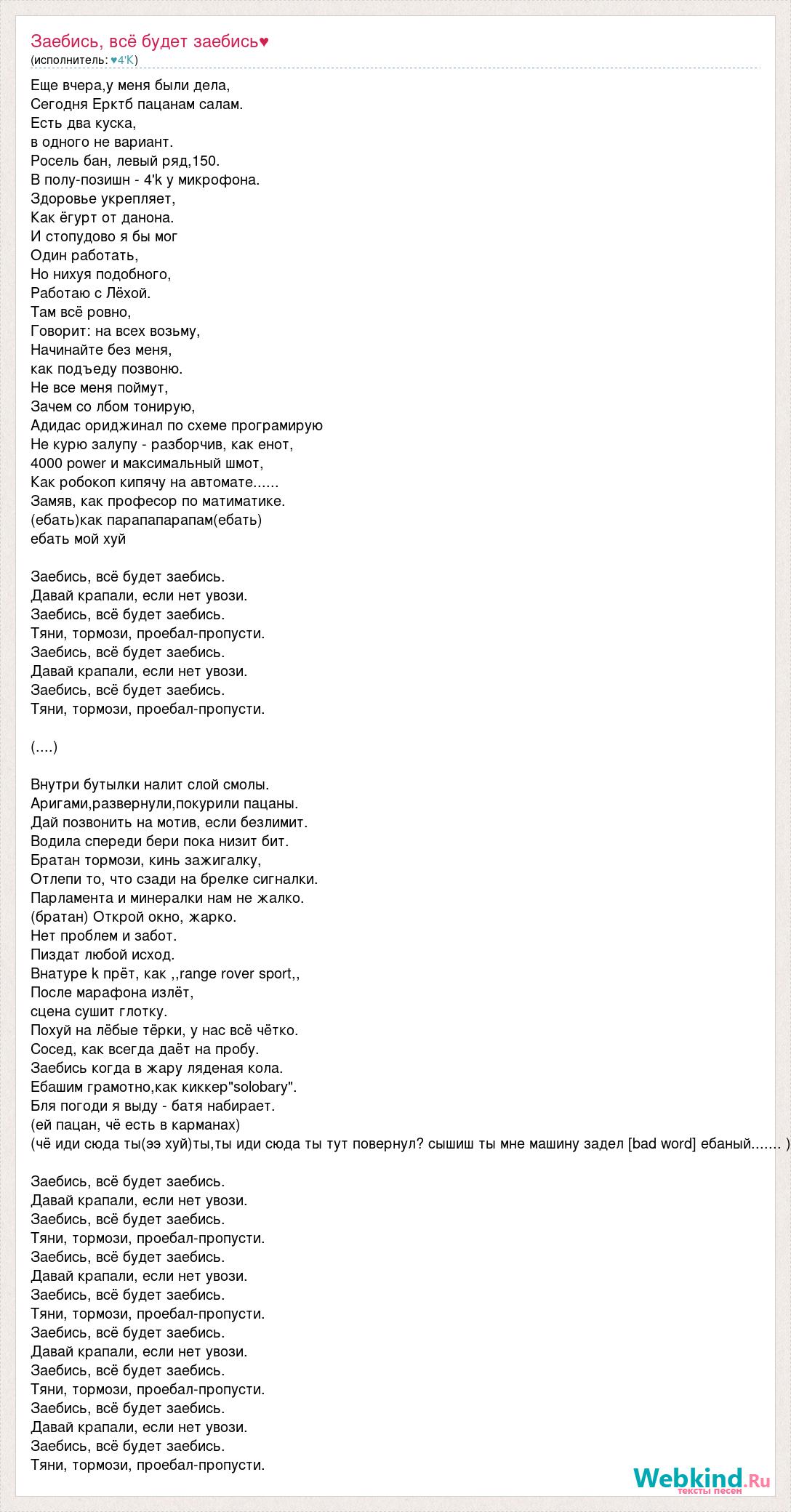 Еще вчера,у меня были дела, Сегодня Ерктб пацанам салам. Есть два куска, в одного не вариант. Росель бан, левый ряд,150. В полу-позишн - 4'k у микрофона. Здоровье укрепляет, Как ёгурт от данона. И стопудово я бы мог Один работать, Но нихуя подобного, Работаю с Лёхой. Там всё ровно, Говорит: на всех возьму, Начинайте без меня, как подъеду позвоню. Не все меня поймут, Зачем со лбом тонирую, Адидас ориджинал по схеме програмирую Не курю залупу - разборчив, как енот, 4000 power и максимальный шмот, Как робокоп кипячу на автомате...... Замяв, как професор по матиматике. (ебать)как парапапарапам(ебать) ебать мой хуй Заебись, всё будет заебись. Давай крапали, если нет увози. Заебись, всё будет заебись. Тяни, тормози, проебал-пропусти. Заебись, всё будет заебись. Давай крапали, если нет увози. Заебись, всё будет заебись. Тяни, тормози, проебал-пропусти. (....) Внутри бутылки налит слой смолы. Аригами,развернули,покурили пацаны. Дай позвонить на мотив, если безлимит. Водила спереди бери пока низит бит. Братан тормози, кинь зажигалку, Отлепи то, что сзади на брелке сигналки. Парламента и минералки нам не жалко. (братан) Открой окно, жарко. Нет проблем и забот. Пиздат любой исход. Внатуре k прёт, как ,,range rover sport,, После марафона излёт, сцена сушит глотку. Похуй на лёбые тёрки, у нас всё чётко. Сосед, как всегда даёт на пробу. Заебись когда в жару ляденая кола. Ебашим грамотно,как киккер"solobary". Бля погоди я выду - батя набирает. (ей пацан, чё есть в карманах) (чё иди сюда ты(ээ хуй)ты,ты иди сюда ты тут повернул? сышиш ты мне машину задел [bad word] ебаный....... ) Заебись, всё будет заебись. Давай крапали, если нет увози. Заебись, всё будет заебись. Тяни, тормози, проебал-пропусти. Заебись, всё будет заебись. Давай крапали, если нет увози. Заебись, всё будет заебись. Тяни, тормози, проебал-пропусти. Заебись, всё будет заебись. Давай крапали, если нет увози. Заебись, всё будет заебись. Тяни, тормози, проебал-пропусти. Заебись, всё будет заебись. Давай крапали, если нет увози. Заебись, всё будет заебись. Тяни, тормози, проебал-пропусти.