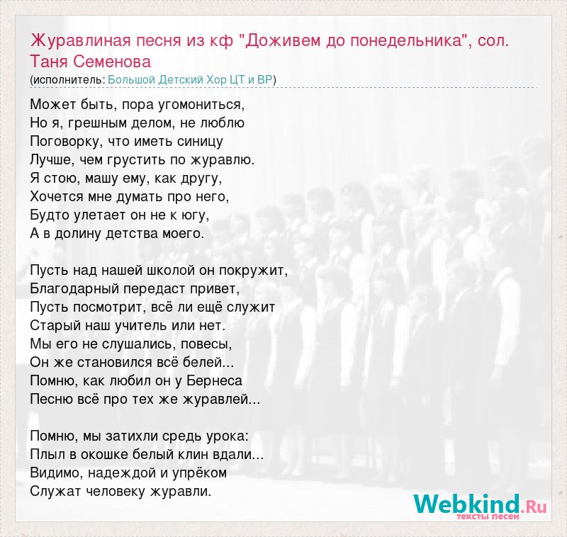 Главная→Исполнители→Большой Детский Хор ЦТ и ВР→Журавлиная песня из кф "Доживем до понедельника", сол. Таня Семенова