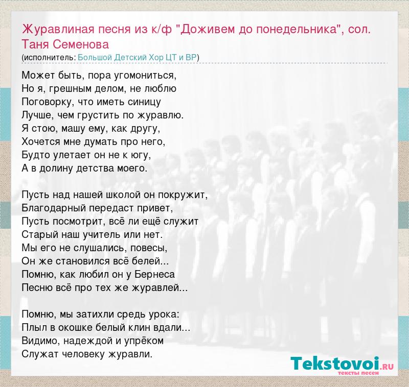 Главная→Исполнители→Большой Детский Хор ЦТ и ВР→Журавлиная песня из к/ф "Доживем до понедельника", сол. Таня Семенова
