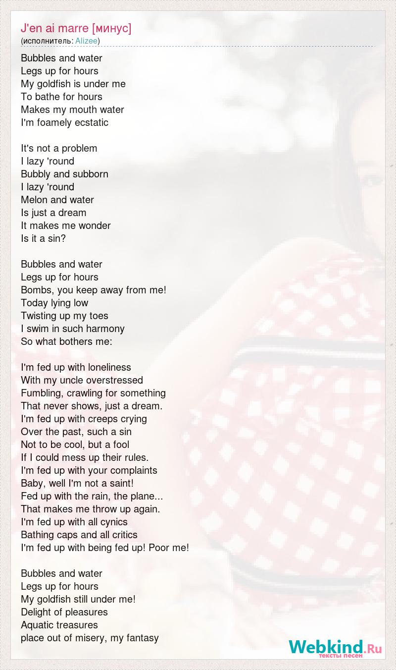 Bubbles and water Legs up for hours My goldfish is under me To bathe for hours Makes my mouth water I'm foamely ecstatic It's not a problem I lazy 'round Bubbly and subborn I lazy 'round Melon and water Is just a dream It makes me wonder Is it a sin? Bubbles and water Legs up for hours Bombs, you keep away from me! Today lying low Twisting up my toes I swim in such harmony So what bothers me: I'm fed up with loneliness With my uncle overstressed Fumbling, crawling for something That never shows, just a dream. I'm fed up with creeps crying Over the past, such a sin Not to be cool, but a fool If I could mess up their rules. I'm fed up with your complaints Baby, well I'm not a saint! Fed up with the rain, the plane... That makes me throw up again. I'm fed up with all cynics Bathing caps and all critics I'm fed up with being fed up! Poor me! Bubbles and water Legs up for hours My goldfish still under me! Delight of pleasures Aquatic treasures place out of misery, my fantasy