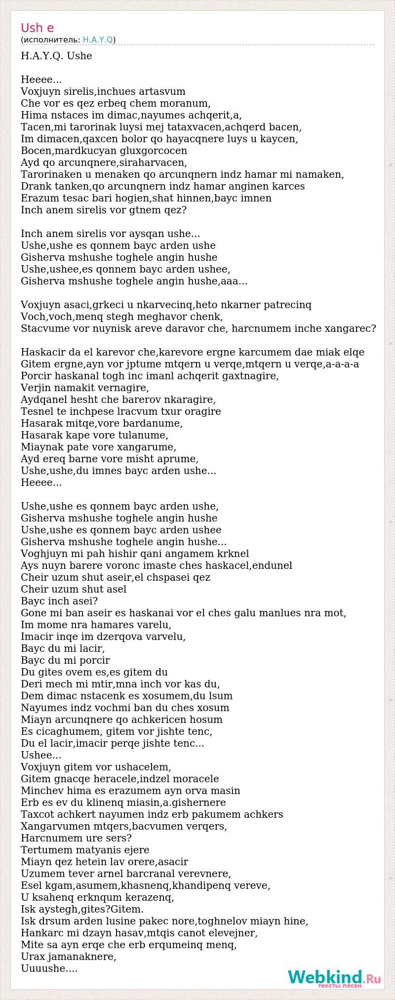 H.A.Y.Q. Ushe Heeee... Voxjuyn sirelis,inchues artasvum Che vor es qez erbeq chem moranum, Hima nstaces im dimac,nayumes achqerit,a, Tacen,mi tarorinak luysi mej tataxvacen,achqerd bacen, Im dimacen,qaxcen bolor qo hayacqnere luys u kaycen, Bocen,mardkucyan gluxgorcocen Ayd qo arcunqnere,siraharvacen, Tarorinaken u menaken qo arcunqnern indz hamar mi namaken, Drank tanken,qo arcunqnern indz hamar anginen karces Erazum tesac bari hogien,shat hinnen,bayc imnen Inch anem sirelis vor gtnem qez? Inch anem sirelis vor aysqan ushe... Ushe,ushe es qonnem bayc arden ushe Gisherva mshushe toghele angin hushe Ushe,ushee,es qonnem bayc arden ushee, Gisherva mshushe toghele angin hushe,aaa... Voxjuyn asaci,grkeci u nkarvecinq,heto nkarner patrecinq Voch,voch,menq stegh meghavor chenk, Stacvume vor nuynisk areve daravor che, harcnumem inche xangarec? Haskacir da el karevor che,karevore ergne karcumem dae miak elqe Gitem ergne,ayn vor jptume mtqern u verqe,mtqern u verqe,a-a-a-a Porcir haskanal togh inc imanl achqerit gaxtnagire, Verjin namakit vernagire, Aydqanel hesht che barerov nkaragire, Tesnel te inchpese lracvum txur oragire Hasarak mitqe,vore bardanume, Hasarak kape vore tulanume, Miaynak pate vore xangarume, Ayd ereq barne vore misht aprume, Ushe,ushe,du imnes bayc arden ushe... Heeee... Ushe,ushe es qonnem bayc arden ushe, Gisherva mshushe toghele angin hushe Ushe,ushe es qonnem bayc arden ushee Gisherva mshushe toghele angin hushe... Voghjuyn mi pah hishir qani angamem krknel Ays nuyn barere voronc imaste ches haskacel,endunel Cheir uzum shut aseir,el chspasei qez Cheir uzum shut asel Bayc inch asei? Gone mi ban aseir es haskanai vor el ches galu manlues nra mot, Im mome nra hamares varelu, Imacir inqe im dzerqova varvelu, Bayc du mi lacir, Bayc du mi porcir Du gites ovem es,es gitem du Deri mech mi mtir,mna inch vor kas du, Dem dimac nstacenk es xosumem,du lsum Nayumes indz vochmi ban du ches xosum Miayn arcunqnere qo achkericen hosum Es cicaghumem, gitem vor jishte tenc, Du el lacir,imacir perqe jishte tenc... Ushee... Voxjuyn gitem vor ushacelem, Gitem gnacqe heracele,indzel moracele Minchev hima es erazumem ayn orva masin Erb es ev du klinenq miasin,a.gishernere Taxcot achkert nayumen indz erb pakumem achkers Xangarvumen mtqers,bacvumen verqers, Harcnumem ure sers? Tertumem matyanis ejere Miayn qez hetein lav orere,asacir Uzumem tever arnel barcranal verevnere, Esel kgam,asumem,khasnenq,khandipenq vereve, U ksahenq erknqum kerazenq, Isk aystegh,gites?Gitem. Isk drsum arden lusine pakec nore,toghnelov miayn hine, Hankarc mi dzayn hasav,mtqis canot elevejner, Mite sa ayn erqe che erb erqumeinq menq, Urax jamanaknere, Uuuushe....