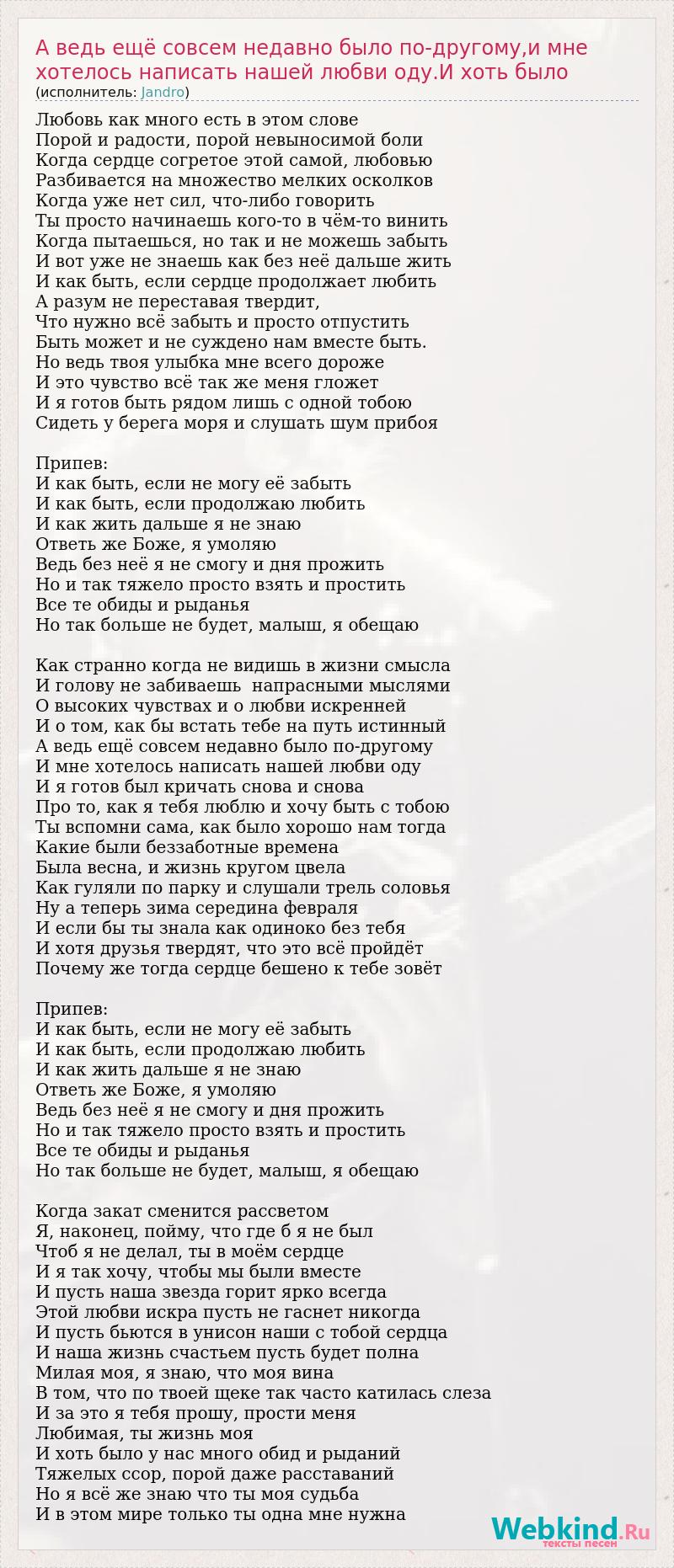 Любовь как много есть в этом слове Порой и радости, порой невыносимой боли Когда сердце согретое этой самой, любовью Разбивается на множество мелких осколков Когда уже нет сил, что-либо говорить Ты просто начинаешь кого-то в чём-то винить Когда пытаешься, но так и не можешь забыть И вот уже не знаешь как без неё дальше жить И как быть, если сердце продолжает любить А разум не переставая твердит, Что нужно всё забыть и просто отпустить Быть может и не суждено нам вместе быть. Но ведь твоя улыбка мне всего дороже И это чувство всё так же меня гложет И я готов быть рядом лишь с одной тобою Сидеть у берега моря и слушать шум прибоя Припев: И как быть, если не могу её забыть И как быть, если продолжаю любить И как жить дальше я не знаю Ответь же Боже, я умоляю Ведь без неё я не смогу и дня прожить Но и так тяжело просто взять и простить Все те обиды и рыданья Но так больше не будет, малыш, я обещаю Как странно когда не видишь в жизни смысла И голову не забиваешь напрасными мыслями О высоких чувствах и о любви искренней И о том, как бы встать тебе на путь истинный А ведь ещё совсем недавно было по-другому И мне хотелось написать нашей любви оду И я готов был кричать снова и снова Про то, как я тебя люблю и хочу быть с тобою Ты вспомни сама, как было хорошо нам тогда Какие были беззаботные времена Была весна, и жизнь кругом цвела Как гуляли по парку и слушали трель соловья Ну а теперь зима середина февраля И если бы ты знала как одиноко без тебя И хотя друзья твердят, что это всё пройдёт Почему же тогда сердце бешено к тебе зовёт Припев: И как быть, если не могу её забыть И как быть, если продолжаю любить И как жить дальше я не знаю Ответь же Боже, я умоляю Ведь без неё я не смогу и дня прожить Но и так тяжело просто взять и простить Все те обиды и рыданья Но так больше не будет, малыш, я обещаю Когда закат сменится рассветом Я, наконец, пойму, что где б я не был Чтоб я не делал, ты в моём сердце И я так хочу, чтобы мы были вместе И пусть наша звезда горит ярко всегда Этой любви искра пусть не гаснет никогда И пусть бьются в унисон наши с тобой сердца И наша жизнь счастьем пусть будет полна Милая моя, я знаю, что моя вина В том, что по твоей щеке так часто катилась слеза И за это я тебя прошу, прости меня Любимая, ты жизнь моя И хоть было у нас много обид и рыданий Тяжелых ссор, порой даже расставаний Но я всё же знаю что ты моя судьба И в этом мире только ты одна мне нужна