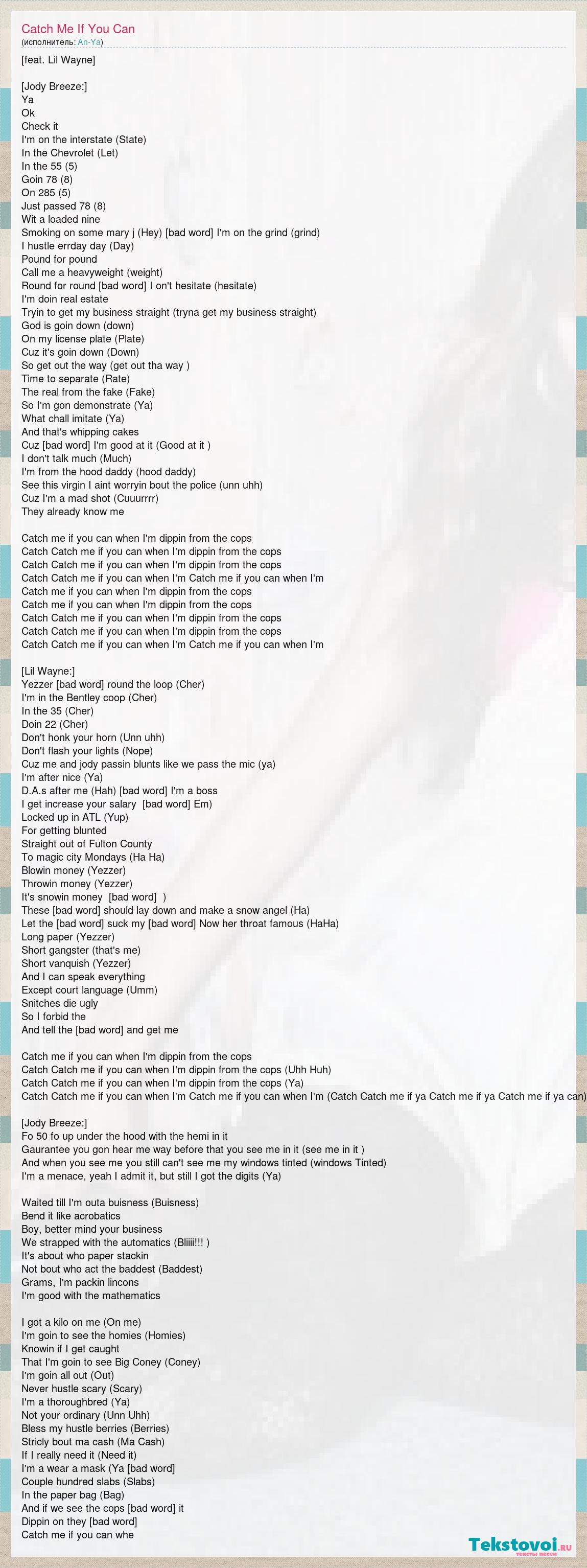 [feat. Lil Wayne] [Jody Breeze:] Ya Ok Check it I'm on the interstate (State) In the Chevrolet (Let) In the 55 (5) Goin 78 (8) On 285 (5) Just passed 78 (8) Wit a loaded nine Smoking on some mary j (Hey) [bad word] I'm on the grind (grind) I hustle errday day (Day) Pound for pound Call me a heavyweight (weight) Round for round [bad word] I on't hesitate (hesitate) I'm doin real estate Tryin to get my business straight (tryna get my business straight) God is goin down (down) On my license plate (Plate) Cuz it's goin down (Down) So get out the way (get out tha way ) Time to separate (Rate) The real from the fake (Fake) So I'm gon demonstrate (Ya) What chall imitate (Ya) And that's whipping cakes Cuz [bad word] I'm good at it (Good at it ) I don't talk much (Much) I'm from the hood daddy (hood daddy) See this virgin I aint worryin bout the police (unn uhh) Cuz I'm a mad shot (Cuuurrrr) They already know me Catch me if you can when I'm dippin from the cops Catch Catch me if you can when I'm dippin from the cops Catch Catch me if you can when I'm dippin from the cops Catch Catch me if you can when I'm Catch me if you can when I'm Catch me if you can when I'm dippin from the cops Catch me if you can when I'm dippin from the cops Catch Catch me if you can when I'm dippin from the cops Catch Catch me if you can when I'm dippin from the cops Catch Catch me if you can when I'm Catch me if you can when I'm [Lil Wayne:] Yezzer I'm comin round the loop (Cher) I'm in the Bentley coop (Cher) In the 35 (Cher) Doin 22 (Cher) Don't honk your horn (Unn uhh) Don't flash your lights (Nope) Cuz me and jody passin blunts like we pass the mic (ya) I'm after nice (Ya) D.A.s after me (Hah) [bad word] I'm a boss I get increase your salary [bad word] Em) Locked up in ATL (Yup) For getting blunted Straight out of Fulton County To magic city Mondays (Ha Ha) Blowin money (Yezzer) Throwin money (Yezzer) It's snowin money [bad word] ) These [bad word] should lay down and make a snow angel (Ha) Let the [bad word] suck my [bad word] Now her throat famous (HaHa) Long paper (Yezzer) Short gangster (that's me) Short vanquish (Yezzer) And I can speak everything Except court language (Umm) Snitches die ugly So I forbid the And tell the pigs Come and get me Catch me if you can when I'm dippin from the cops Catch Catch me if you can when I'm dippin from the cops (Uhh Huh) Catch Catch me if you can when I'm dippin from the cops (Ya) Catch Catch me if you can when I'm Catch me if you can when I'm (Catch Catch me if ya Catch me if ya Catch me if ya can) [Jody Breeze:] Fo 50 fo up under the hood with the hemi in it Gaurantee you gon hear me way before that you see me in it (see me in it ) And when you see me you still can't see me my windows tinted (windows Tinted) I'm a menace, yeah I admit it, but still I got the digits (Ya) Waited till I'm outa buisness (Buisness) Bend it like acrobatics Boy, better mind your business We strapped with the automatics (Bliiii!!! ) It's about who paper stackin Not bout who act the baddest (Baddest) Grams, I'm packin lincons I'm good with the mathematics I got a kilo on me (On me) I'm goin to see the homies (Homies) Knowin if I get caught That I'm goin to see Big Coney (Coney) I'm goin all out (Out) Never hustle scary (Scary) I'm a thoroughbred (Ya) Not your ordinary (Unn Uhh) Bless my hustle berries (Berries) Stricly bout ma cash (Ma Cash) If I really need it (Need it) I'm a wear a mask (Ya [bad word] Couple hundred slabs (Slabs) In the paper bag (Bag) And if we see the cops [bad word] it Dippin on they [bad word] Catch me if you can whe
