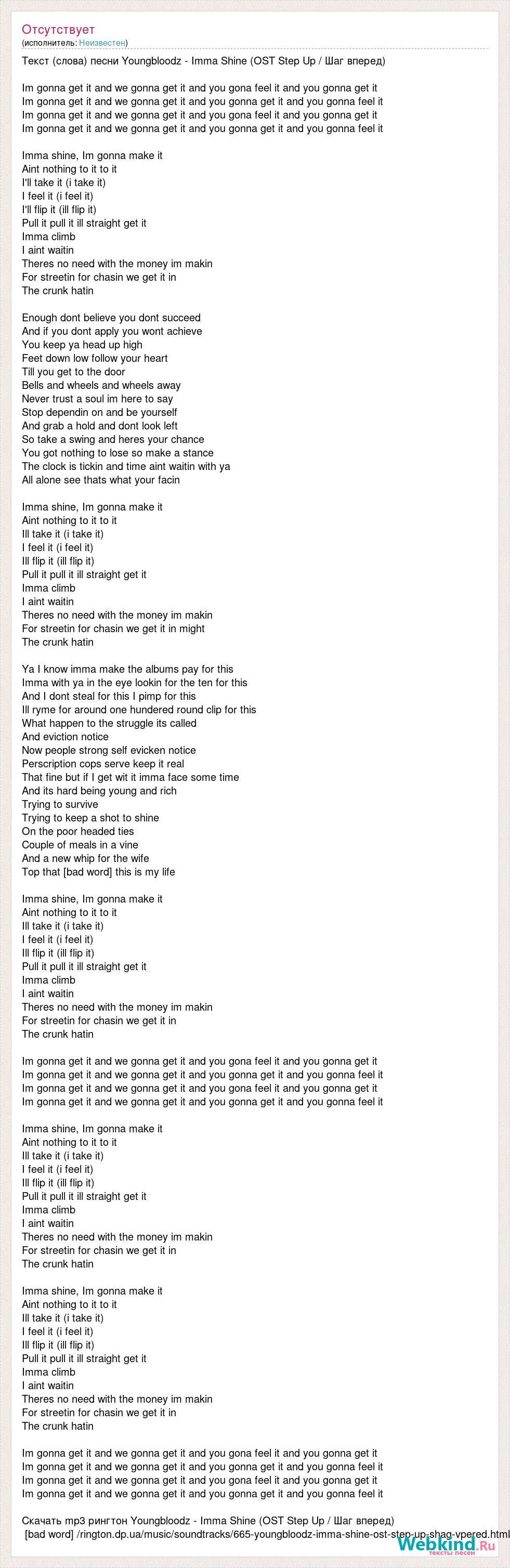 Текст (слова) песни Youngbloodz - Imma Shine (OST Step Up / Шаг вперед) Im gonna get it and we gonna get it and you gona feel it and you gonna get it Im gonna get it and we gonna get it and you gonna get it and you gonna feel it Im gonna get it and we gonna get it and you gona feel it and you gonna get it Im gonna get it and we gonna get it and you gonna get it and you gonna feel it Imma shine, Im gonna make it Aint nothing to it to it I'll take it (i take it) I feel it (i feel it) I'll flip it (ill flip it) Pull it pull it ill straight get it Imma climb I aint waitin Theres no need with the money im makin For streetin for chasin we get it in The crunk hatin Enough dont believe you dont succeed And if you dont apply you wont achieve You keep ya head up high Feet down low follow your heart Till you get to the door Bells and wheels and wheels away Never trust a soul im here to say Stop dependin on and be yourself And grab a hold and dont look left So take a swing and heres your chance You got nothing to lose so make a stance The clock is tickin and time aint waitin with ya All alone see thats what your facin Imma shine, Im gonna make it Aint nothing to it to it Ill take it (i take it) I feel it (i feel it) Ill flip it (ill flip it) Pull it pull it ill straight get it Imma climb I aint waitin Theres no need with the money im makin For streetin for chasin we get it in might The crunk hatin Ya I know imma make the albums pay for this Imma with ya in the eye lookin for the ten for this And I dont steal for this I pimp for this Ill ryme for around one hundered round clip for this What happen to the struggle its called And eviction notice Now people strong self evicken notice Perscription cops serve keep it real That fine but if I get wit it imma face some time And its hard being young and rich Trying to survive Trying to keep a shot to shine On the poor headed ties Couple of meals in a vine And a new whip for the wife Top that [bad word] this is my life Imma shine, Im gonna make it Aint nothing to it to it Ill take it (i take it) I feel it (i feel it) Ill flip it (ill flip it) Pull it pull it ill straight get it Imma climb I aint waitin Theres no need with the money im makin For streetin for chasin we get it in The crunk hatin Im gonna get it and we gonna get it and you gona feel it and you gonna get it Im gonna get it and we gonna get it and you gonna get it and you gonna feel it Im gonna get it and we gonna get it and you gona feel it and you gonna get it Im gonna get it and we gonna get it and you gonna get it and you gonna feel it Imma shine, Im gonna make it Aint nothing to it to it Ill take it (i take it) I feel it (i feel it) Ill flip it (ill flip it) Pull it pull it ill straight get it Imma climb I aint waitin Theres no need with the money im makin For streetin for chasin we get it in The crunk hatin Imma shine, Im gonna make it Aint nothing to it to it Ill take it (i take it) I feel it (i feel it) Ill flip it (ill flip it) Pull it pull it ill straight get it Imma climb I aint waitin Theres no need with the money im makin For streetin for chasin we get it in The crunk hatin Im gonna get it and we gonna get it and you gona feel it and you gonna get it Im gonna get it and we gonna get it and you gonna get it and you gonna feel it Im gonna get it and we gonna get it and you gona feel it and you gonna get it Im gonna get it and we gonna get it and you gonna get it and you gonna feel it Скачать mp3 рингтон Youngbloodz - Imma Shine (OST Step Up / Шаг вперед) [bad word] /rington.dp.ua/music/soundtracks/665-youngbloodz-imma-shine-ost-step-up-shag-vpered.html