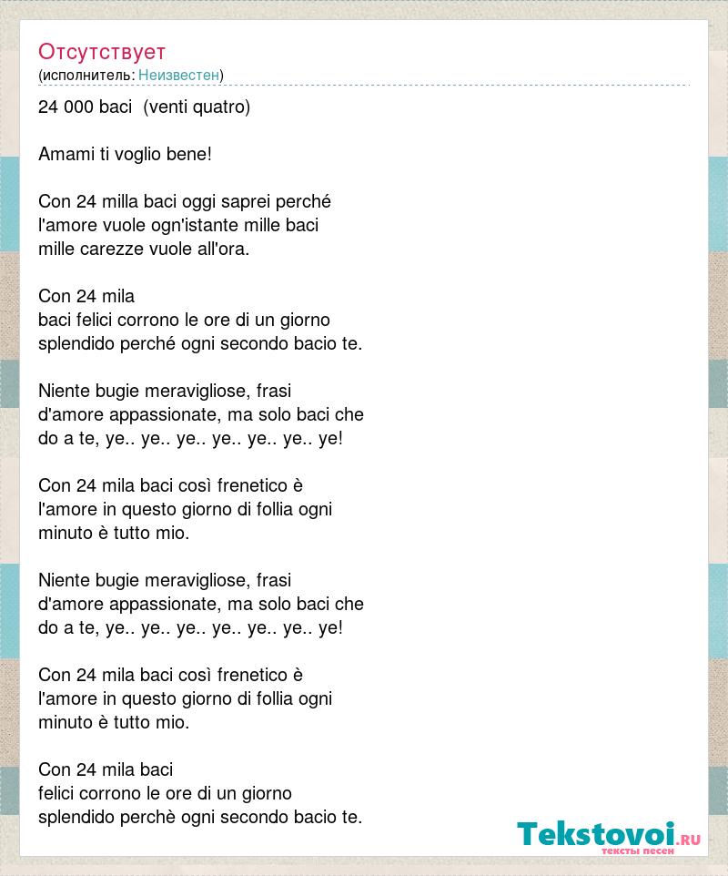 24 000 baci (venti quatro) Amami ti voglio bene! Con 24 milla baci oggi saprei perché l'amore vuole ogn'istante mille baci mille carezze vuole all'ora. Con 24 mila baci felici corrono le ore di un giorno splendido perché ogni secondo bacio te. Niente bugie meravigliose, frasi d'amore appassionate, ma solo baci che do a te, ye.. ye.. ye.. ye.. ye.. ye.. ye! Con 24 mila baci così frenetico è l'amore in questo giorno di follia ogni minuto è tutto mio. Niente bugie meravigliose, frasi d'amore appassionate, ma solo baci che do a te, ye.. ye.. ye.. ye.. ye.. ye.. ye! Con 24 mila baci così frenetico è l'amore in questo giorno di follia ogni minuto è tutto mio. Con 24 mila baci felici corrono le ore di un giorno splendido perchè ogni secondo bacio te.