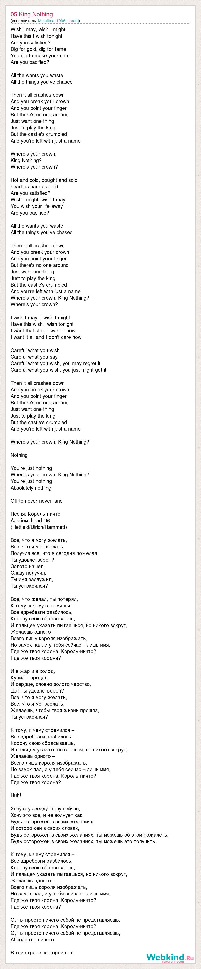 Wish I may, wish I might Have this I wish tonight Are you satisfied? Dig for gold, dig for fame You dig to make your name Are you pacified? All the wants you waste All the things you've chased Then it all crashes down And you break your crown And you point your finger But there's no one around Just want one thing Just to play the king But the castle's crumbled And you're left with just a name Where's your crown, King Nothing? Where's your crown? Hot and cold, bought and sold heart as hard as gold Are you satisfied? Wish I might, wish I may You wish your life away Are you pacified? All the wants you waste All the things you've chased Then it all crashes down And you break your crown And you point your finger But there's no one around Just want one thing Just to play the king But the castle's crumbled And you're left with just a name Where's your crown, King Nothing? Where's your crown? I wish I may, I wish I might Have this wish I wish tonight I want that star, I want it now I want it all and I don't care how Careful what you wish Careful what you say Careful what you wish, you may regret it Careful what you wish, you just might get it Then it all crashes down And you break your crown And you point your finger But there's no one around Just want one thing Just to play the king But the castle's crumbled And you're left with just a name Where's your crown, King Nothing? Nothing You're just nothing Where's your crown, King Nothing? You're just nothing Absolutely nothing Off to never-never land Песня: Король-ничто Альбом: Load ‘96 (Hetfield/Ulrich/Hammett) Все, что я могу желать, Все, что я мог желать, Получил все, что я сегодня пожелал, Ты удовлетворен? Золото нашел, Славу получил, Ты имя заслужил, Ты успокоился? Все, что желал, ты потерял, К тому, к чему стремился – Все вдребезги разбилось, Корону свою сбрасываешь, И пальцем указать пытаешься, но никого вокруг, Желаешь одного – Всего лишь короля изображать, Но замок пал, и у тебя сейчас – лишь имя, Где же твоя корона, Король-ничто? Где же твоя корона? И в жар и в холод, Купил – продал, И сердце, словно золото черство, Да! Ты удовлетворен? Все, что я могу желать, Все, что я мог желать, Желаешь, чтобы твоя жизнь прошла, Ты успокоился? К тому, к чему стремился – Все вдребезги разбилось, Корону свою сбрасываешь, И пальцем указать пытаешься, но никого вокруг, Желаешь одного – Всего лишь короля изображать, Но замок пал, и у тебя сейчас – лишь имя, Где же твоя корона, Король-ничто? Где же твоя корона? Huh! Хочу эту звезду, хочу сейчас, Хочу это все, и не волнует как, Будь осторожен в своих желаниях, И осторожен в своих словах, Будь осторожен в своих желаниях, ты можешь об этом пожалеть, Будь осторожен в своих желаниях, ты можешь это получить. К тому, к чему стремился – Все вдребезги разбилось, Корону свою сбрасываешь, И пальцем указать пытаешься, но никого вокруг, Желаешь одного – Всего лишь короля изображать, Но замок пал, и у тебя сейчас – лишь имя, Где же твоя корона, Король-ничто? Где же твоя корона? О, ты просто ничего собой не представляешь, Где же твоя корона, Король-ничто? О, ты просто ничего собой не представляешь, Абсолютно ничего В той стране, которой нет.