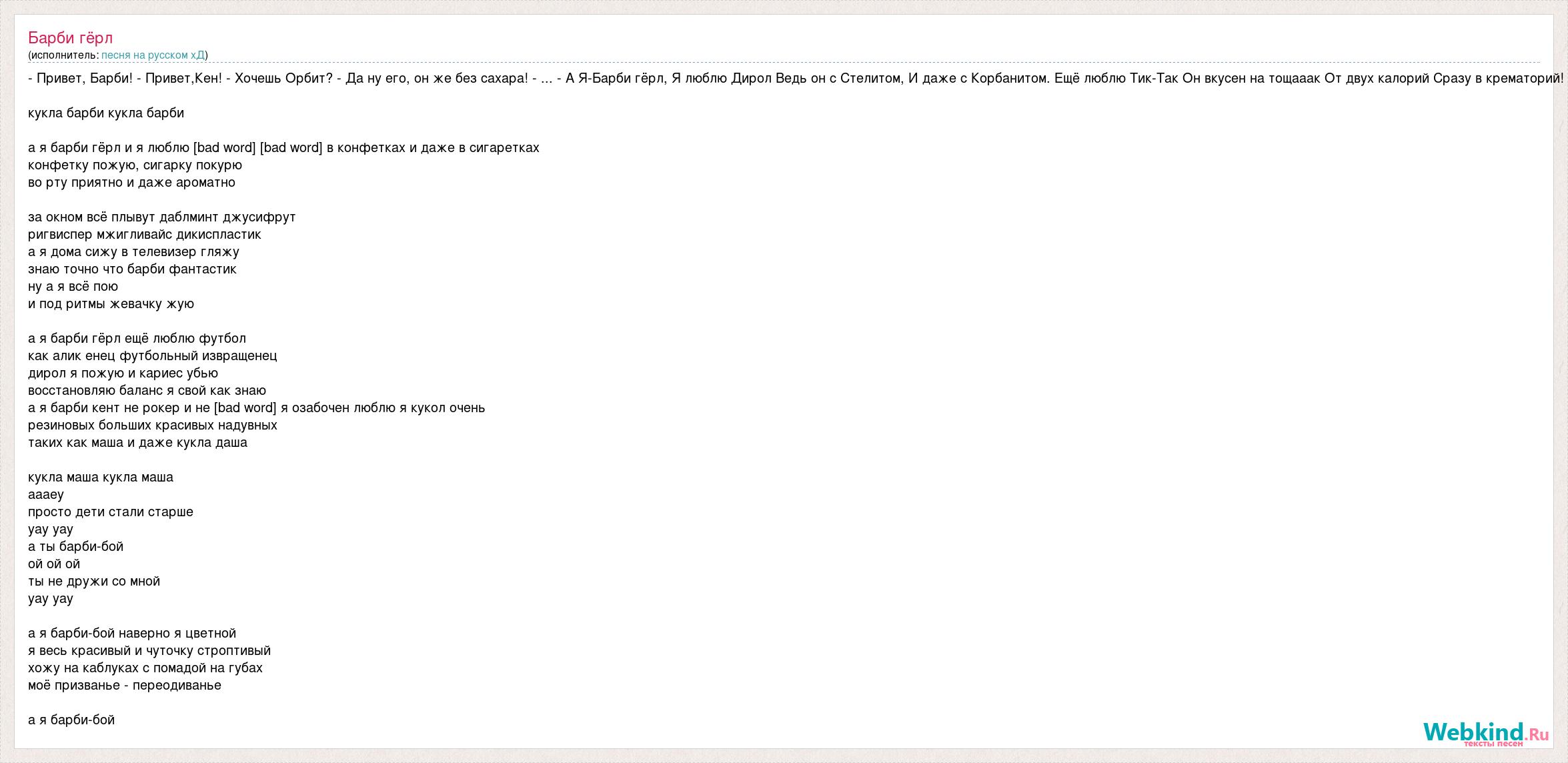 - Привет, Барби! - Привет,Кен! - Хочешь Орбит? - Да ну его, он же без сахара! - ... - А Я-Барби гёрл, Я люблю Дирол Ведь он с Стелитом, И даже с Корбанитом. Ещё люблю Тик-Так Он вкусен на тощааак От двух калорий Сразу в крематорий! кукла барби кукла барби а я барби гёрл и я люблю [bad word] [bad word] в конфетках и даже в сигаретках конфетку пожую, сигарку покурю во рту приятно и даже ароматно за окном всё плывут даблминт джусифрут ригвиспер мжигливайс дикиспластик а я дома сижу в телевизер гляжу знаю точно что барби фантастик ну а я всё пою и под ритмы жевачку жую а я барби гёрл ещё люблю футбол как алик енец футбольный извращенец дирол я пожую и кариес убью восстановляю баланс я свой как знаю а я барби кент не рокер и не [bad word] я озабочен люблю я кукол очень резиновых больших красивых надувных таких как маша и даже кукла даша кукла маша кукла маша аааеу просто дети стали старше уау уау а ты барби-бой ой ой ой ты не дружи со мной уау уау а я барби-бой наверно я цветной я весь красивый и чуточку строптивый хожу на каблуках с помадой на губах моё призванье - переодиванье а я барби-бой